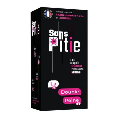 Après une année passée en réunions, apéros et rendez-vous virtuels vous allez enfin pouvoir vous lâcher le temps d'une soirée entre amis et en famille et cela sans aucune retenue ! La double peine, c'est 600 nouvelles cartes qui font la part belle aux appli de rencontres, aux premiers amours ou aux coups d'un soir le tout dans la rigolade, la dérision et la convivialité Le principe du jeu ? A partir d'une carte situation, représentée par une carte posée par un joueur (le maître du jeu) les autres joueurs doivent choisir la réponse qui sera la plus à même de le faire rire Le maître du jeu choisit donc la réponse qui lui plait le plus et son auteur marque un point et devient le maître du jeu pour le tour suivant. Le premier joueur qui marque 7 points gagne la partie.
