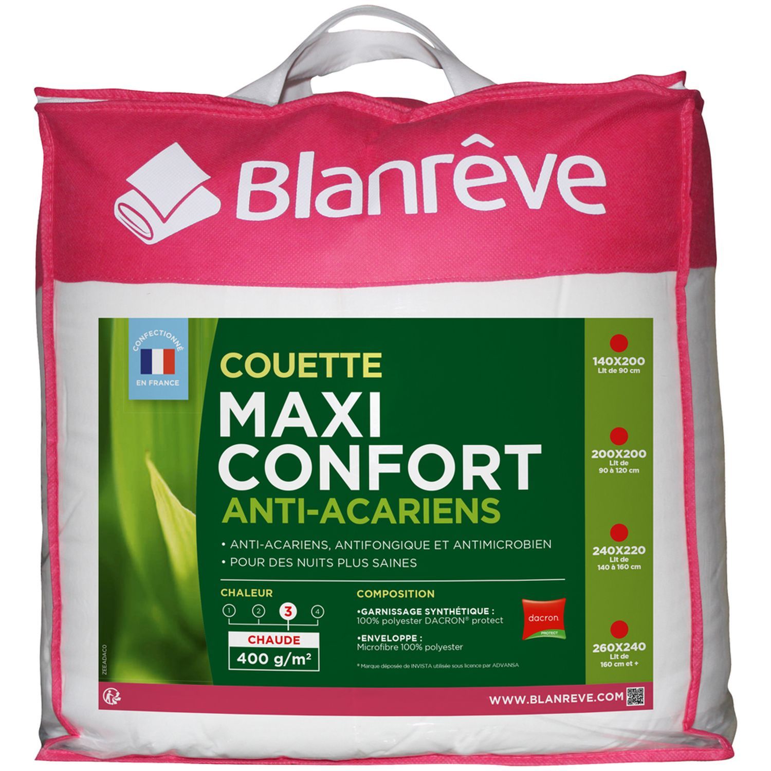 Adoptez cette couette chaude en microfibre anti-acariens MAXI CONFORT pour des nuits plus saines. Garnissage 100% polyester et envoloppe 100% microfibre polyester.