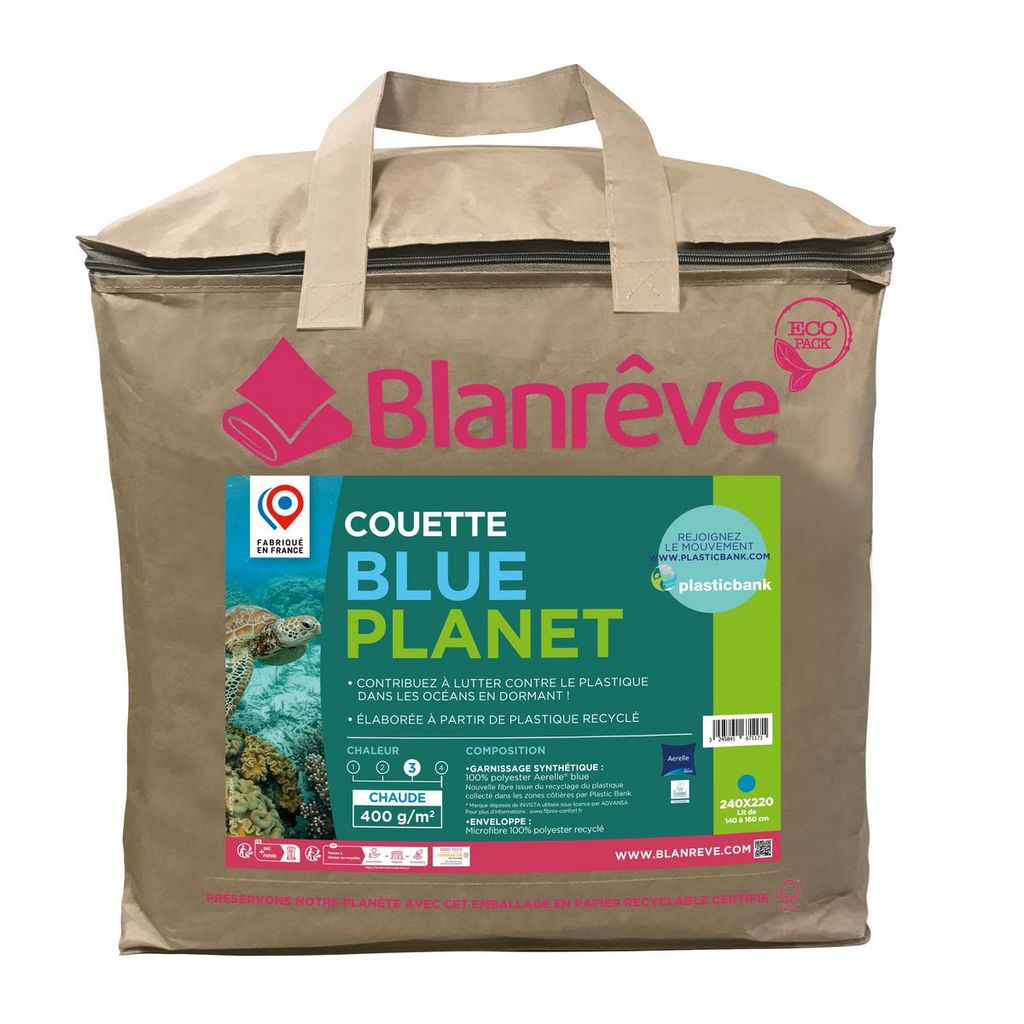 Couette chaude en polyester Aerelle Blue 400 g/m² BLUE PLANET, pour une couette responsable de l'environnement ! Couette fabriquée en France.