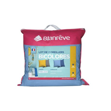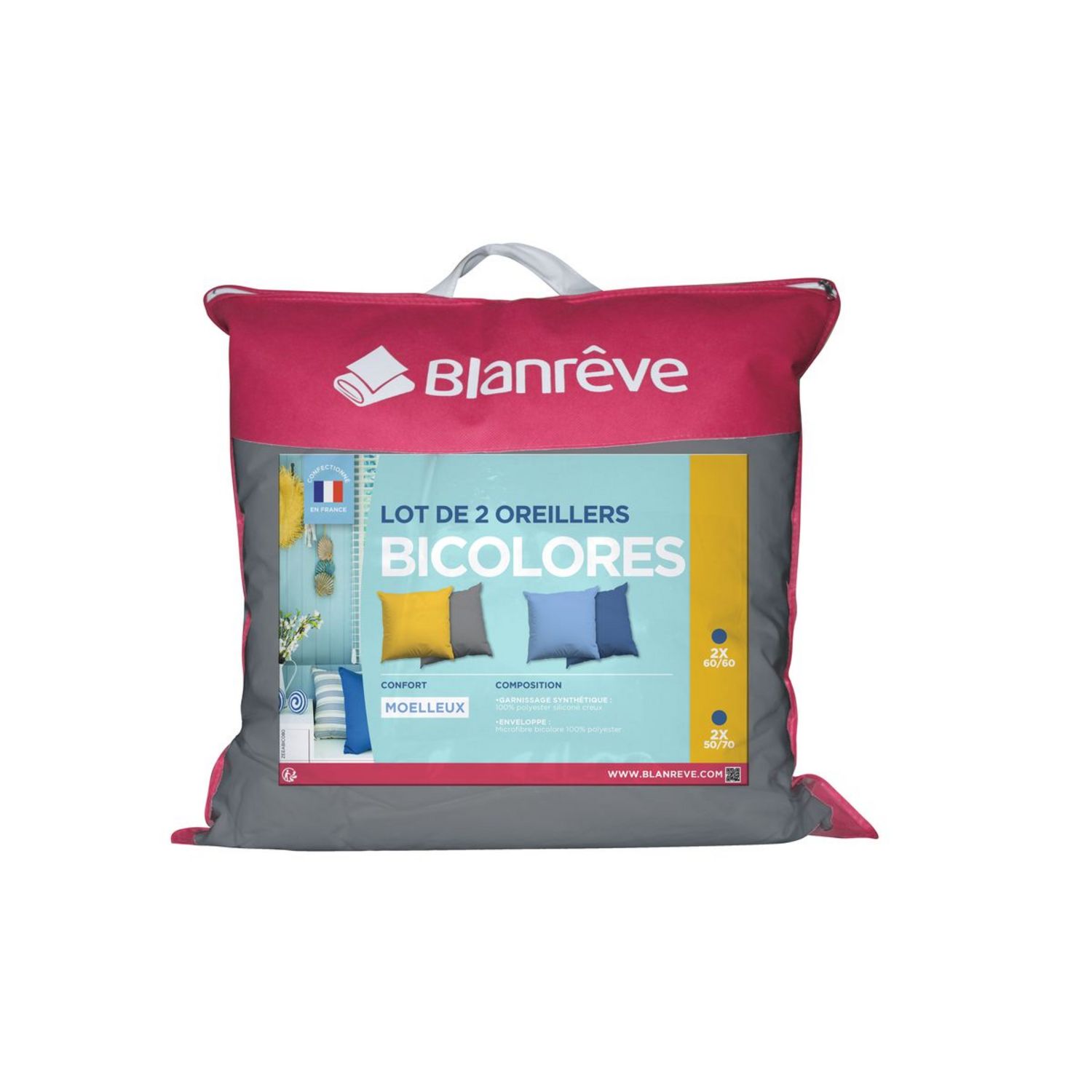 Lot de 2 oreillers moelleux Bicolore, disponible en 2 coloris réversibles : bleu foncé / bleu clair et gris / jaune. Garnissage 100% polyester siliconé creux. Enveloppe microfibre 100% polyester.