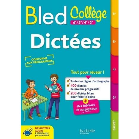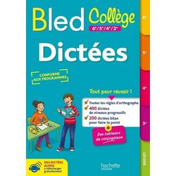L'outil de référence des collégiens ! L'exercice de la dictée est essentiel dans l'apprentissage de l'orthographe car il demande de mobiliser plusieurs règles à la fois. Le BLED Dictées collège assure ta révision systématique des règles tout en développant les réflexes nécessaires à la bonne utilisation des connaissances. -les règles d'orthographe, clairement expliquées et illustrées par de nombreux exemples - 400 dictées de phrases, pour assimiler les règles de manière progressive - 200 dictées bilan, pour faire le point et revoir les règles qui précèdent et celles abordées depuis le début du recueil - 30 dictées données au brevet des collèges afin de s'entraîner efficacement - Des tableaux de conjugaison de verbes modèles et des principaux verbes irréguliers. EN PLUS ! Des dictées en version audio accessibles grâce aux QR codes ou téléchargeables sur notre site.