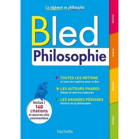 Le BLED Philosophie s'adresse aux lycéens qui préparent le Bac, aux étudiants de l'université ou des altes préparatoires, et à tous les esprits curieux de mieux connaître la philosophie. Un ouvrage de référence complet et pratique ! Pour chaque notion du programme du Bac : l'exposé des concepts et des auteurs clés liés à cette notion , les citations les plus connues, expliquées et commentées. Une histoire de la philosophie, avec pour chaque philosophe : une courte biographie , les thèses principales, expliquées et commentées , l'analyse détaillée d'une oeuvre majeure.