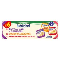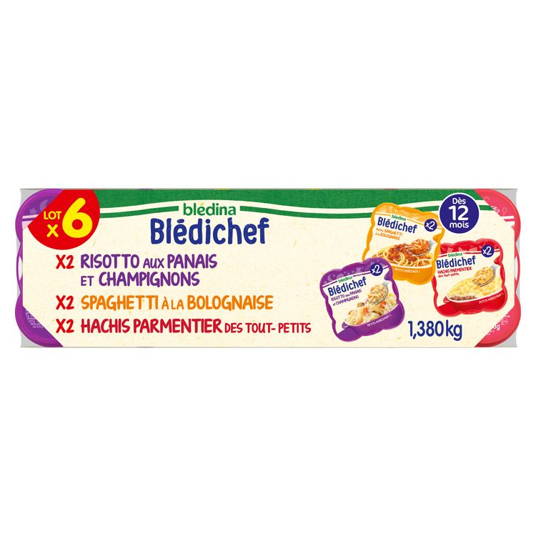 BLEDINA BLEDICHEF X6 Hachis Parmentier des Touts Petits : Ingrédients : Pommes de terre 56,3 % - Lait écrémé reconstitué à base de lait en poudre 15,0 % (LAIT) - Viande de boeuf 10,7 % - Eau de cuisson - Oignons - Amidon de maïs - Beurre (LAIT) - Huiles végétales (colza, tournesol) - Sel - Acérola en poudre - Poivre noir - MuscadeBLEDINA BLEDICHEF X6 Spaghetti à la bolognaise : Ingrédients : Purée de tomates à base de concentré 49,5 % - Pâtes cuites 15,2 % (Semoule de blé dur (GLUTEN), Blanc d'œuf (OEUFS)) - Carottes - Viande de boeuf 9,77 % - Oignons - Pommes de terre - Céleri (CELERI) - Amidon de maïs - Huiles végétales (Olive, Colza, tournesol) - Ail - Sel - Origan - Poivre noir - LaurierBLEDINA BLEDICHEF X6 Risotto aux Panais et Champignons,: Ingrédients : Eau de cuisson - Panais 20,0 % - Riz cuit 15,2 % - Carottes - Pommes de terre - Oignons - Champignons 4,00 % - Crème 3 ,33 % (LAIT) - Poireaux - Amidon de maïs - Huiles végétales (colza, tournesol) - Persil - Sel - Thym - Ail - Laurier - Poivre noir