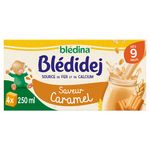 Expert de la diversification alimentaire depuis plus de 100 ans, Blédina vous accompagne pour tous les repas de votre bébé. Notre mission ? Eveiller sa curiosité pour le manger vrai, grâce à plus de 250 recettes conçues par des nutritionnistes et parfaitement adaptées à ses besoins. BLEDIDEJ® de BLEDINA, une gamme pour régaler bébé au petit déjeuner. 4 briques prêtes à l'emploi Saveur Caramel dès 9 mois.  Pour varier les plaisirs, faites découvrir de temps en temps à votre bébé la douceur et les différentes saveurs de nos recettes Bledidej® ! Blédidej® c'est un petit déjeuner gourmand dans un format pratique prêt à l'usage !