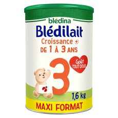 Nos experts en nutrition infantile ont developpé BLEDILAIT CROISSANCE+, Maxi Format 1,6kg de 1 à 3 ans, une formule avec tout ce dont bébé a besoin ! (Dans le cade d'une alimentation diversifiée, conformément à la réglementation, comme toutes les préparations de suite.) BLEDILAIT CROISSANCE +apporte 29X PLUS DE FER (1) que dans le lait de vache 13 x plus de Vitamine D (2) qui contribue au fonctionnement normal du système immunitaire*, à la croissance et au développement osseux normaux et 8 x plus Acide Gras Essentiel (3) qui contribue au développement normal du cerveau ** (1) Par rapport au lait de vache demi-écrémé UHT, Anses, Ciqual, 2020 (2) Par rapport au lait de vache entier UHT, Anses, Ciqual, 2020. (3) Par rapport au lait de vache demi-écrémé UHT, Anses, Ciqual, 2020. (Acide alpha-linolénique) *Les vitamines A, C et D contribuent au fonctionnement normal du système immunitaire. ** Le fer et les omega 3 contribuent au développement cognitif et cérébral normaux..