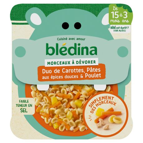 Expert de la diversification alimentaire depuis plus de 100 ans, Blédina vous accompagne pour tous les repas de votre bébé. Notre mission ? Eveiller sa curiosité pour le manger vrai, grâce à plus de 250 recettes conçues par des nutritionnistes et parfaitement adaptées à ses besoins. Découvrez les petits plats BLEDINA MORCEAUX À DEVORER de 15 mois à 3 ans. Duo de Carottes, Pâtes aux épices douces & Poulet. Un plat complet pour le midi composé d'ingrédients parfaitement reconnaissables pour apprendre à votre bébé à manger progressivement comme un grand. Aidez le à reconnaitre tous les bons ingrédients de son assiette ! Bébé est-il prêt ? Proposez lui ce petit plat uniquement s'il : - Se tient assis et se déplace tout seul - A déjà deux dents - Mange des plats avec des morceaux plus ou moins fondants - Mange un quignon de pain