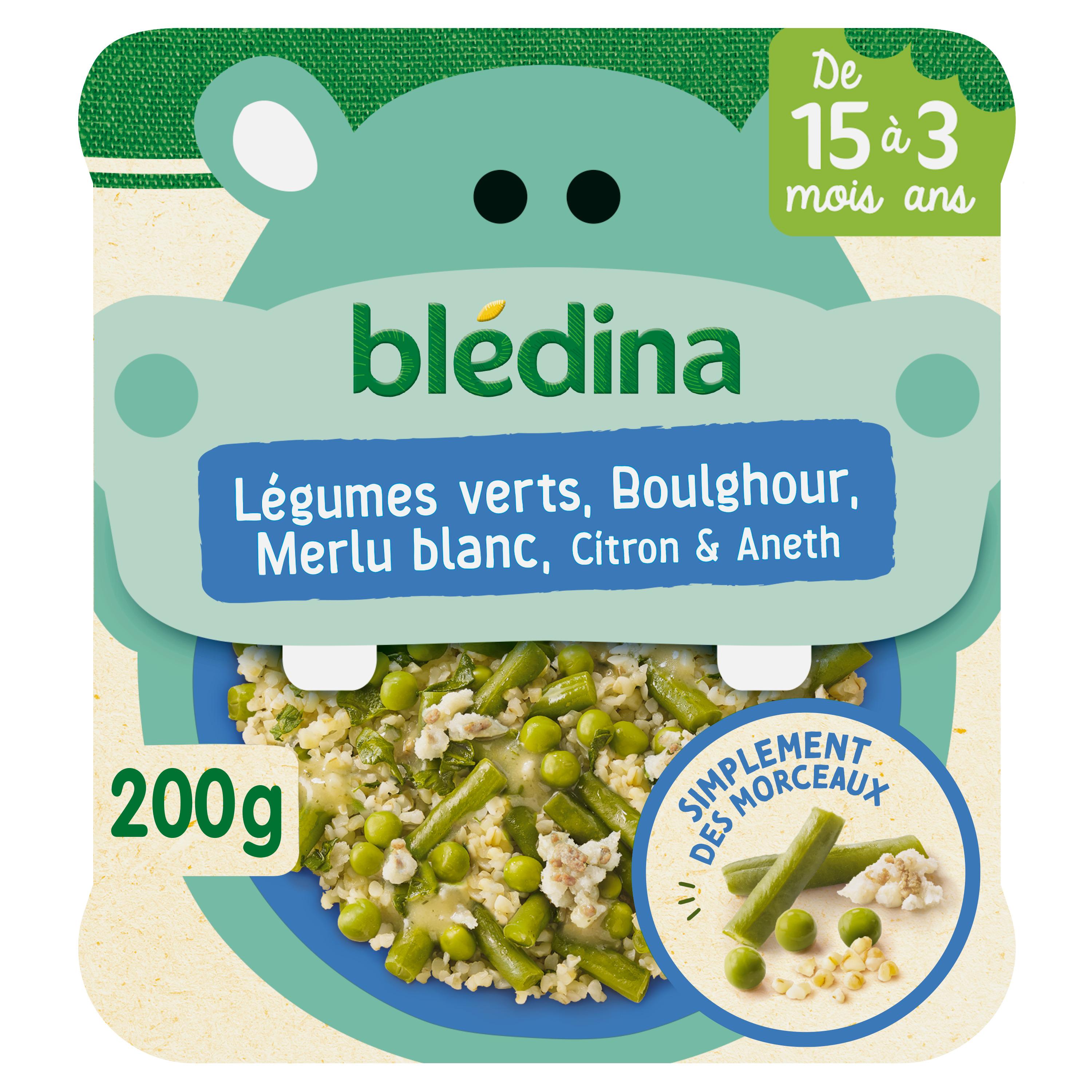 Expert de la diversification alimentaire depuis plus de 100 ans, Blédina vous accompagne pour tous les repas de votre bébé. Notre mission ? Eveiller sa curiosité pour le manger vrai, grâce à plus de 250 recettes conçues par des nutritionnistes et parfaitement adaptées à ses besoins. Découvrez les petits plats BLEDINA MORCEAUX À DEVORER de 15 mois à 3 ans. Légumes verts, Boulghour, Merlu blanc, Citron & Aneth. Un plat complet pour le midi composé d'ingrédients parfaitement reconnaissables pour apprendre à votre bébé à manger progressivement comme un grand. Aidez le à reconnaitre tous les bons ingrédients de son assiette ! Bébé est-il prêt ? Proposez lui ce petit plat uniquement s'il : - Se tient assis et se déplace tout seul - A déjà deux dents - Mange des plats avec des morceaux plus ou moins fondants - Mange un quignon de pain