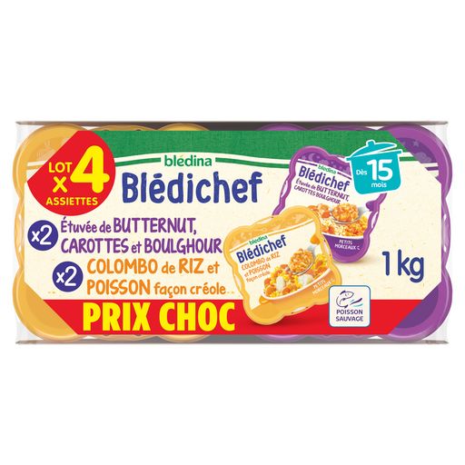 BLEDICHEF x4 15M Butternut Carotte Boulghour Ingrédients : Eau de cuisson - Butternut 25,0 % - Carottes 20,0 % - Boulghour cuit 15,0 % (GLUTEN) - Pommes de terre - Oignons - Crème (LAIT) - Amidon de maïs - Huiles végétales (colza, tournesol) - Ciboulette - Sel - Ail - Muscade - Cannelle BLEDICHEF x4 15M Colombo de Riz et Poisson : Ingrédients : Eau de cuisson - Carottes 20,0 % - Riz cuit 17,1 % - Pommes de terre 9,33 % - Poisson blanc 9,30 % (POISSON) - Purée d e tomates 8,32 % - Oignons - Amidon de maïs - Beurre (LAIT) - Ail - Basilic - Mélange d'épices (Muscade, Curcuma, Cumin, Poivre noir ) - Huiles végétales (colza, tournesol) - Sel - Thym - Clou de girofle