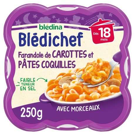Expert de la diversification alimentaire depuis plus de 100 ans, Blédina vous accompagne pour tous les repas de votre bébé. Notre mission ? Eveiller sa curiosité pour le manger vrai, grâce à plus de 250 recettes conçues par des nutritionnistes et parfaitement adaptées à ses besoins. Blédina Blédichef - Farandole de Carottes Pâtes Coquilles dès 18 mois. La douceur de la carotte associée avec des pâtes coquilles, BLEDICHEF accompagne Bébé dans la découverte des textures !