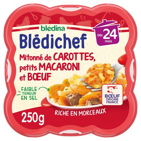 Blédichef, des petits plats de grands spécialement concoctés pour répondre aux besoins des bébés : -Des recettes cuisinées en France -Des morceaux qui évoluent selon l'âge de bébé -Faible Teneur en Sel