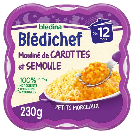 Expert de la diversification alimentaire depuis plus de 100 ans, Blédina vous accompagne pour tous les repas de votre bébé. Notre mission ? Eveiller sa curiosité pour le manger vrai, grâce à plus de 250 recettes conçues par des nutritionnistes et parfaitement adaptées à ses besoins. Blédina Blédichef - Mouliné de Carottes et Semoule dès 12 mois. La douceur de la carotte associée à une fine semoule pour un plat BLEDICHEF tout en douceur.