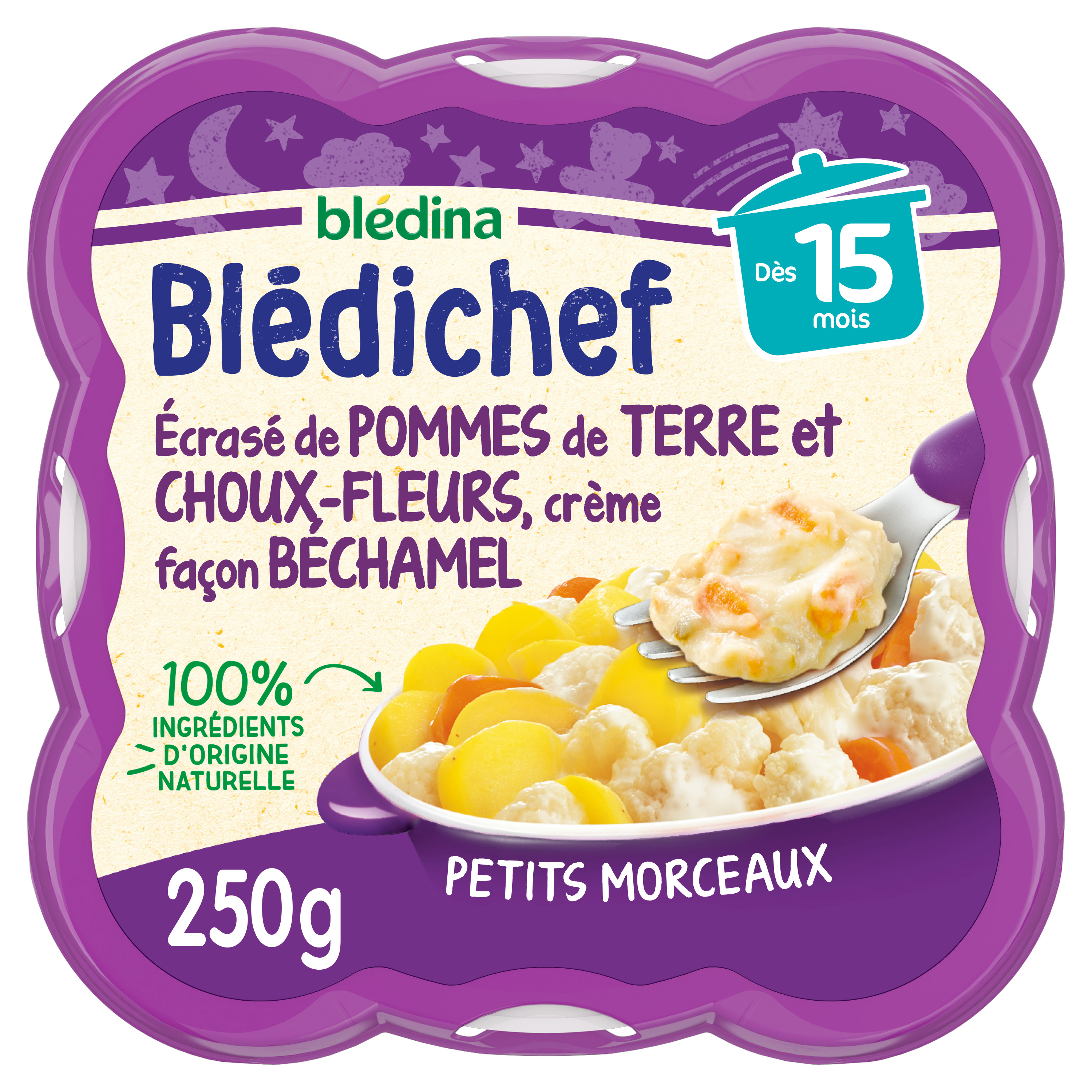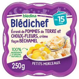 Expert de la diversification alimentaire depuis plus de 100 ans, Blédina vous accompagne pour tous les repas de votre bébé. Notre mission ? Eveiller sa curiosité pour le manger vrai, grâce à plus de 250 recettes conçues par des nutritionnistes et parfaitement adaptées à ses besoins. Blédina Blédichef - Ecrasé de Pommes de Terre Choux-Fleurs Crème façon Béchamel dès 15 mois. Le mariage entre le chou-fleur et la pomme de terre cuisinés façon béchamel pour un plat BLEDICHEF gourmand qui plaira aux papilles de bébé.