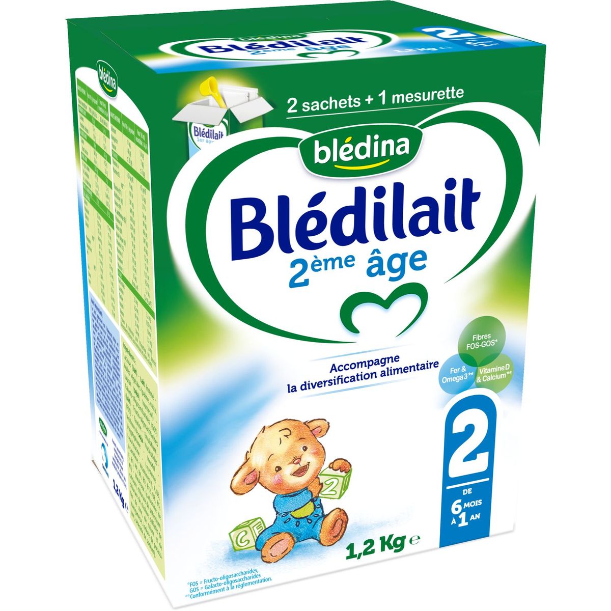 Lait de suite "Pourquoi choisir Blédilait 2ème âge en accompagnement de la diversification alimentaire ? De 6 mois à 1 an, l'organisme de votre enfant est encore en développement. C'est pourquoi les experts de blédina, spécialisés en nutrition infantile, ont développé Blédilait 2ème âge, une formule qui répond à ses besoins spécifiques* dans le cadre d'une alimentation diversifiée, avec : - Du Fer* - Des Oméga 3* - Du Calcium* - De la Vitamine D* - Des Fibres FOS/GOS** *Conformément à la réglementation. **FOS: Fructo-oligosaccharides/ GOS : Galacto-oligosaccharides Blédilait 2ème âge 1,2Kg est un format économique et pratique à emporter avec ces 2 sachets de 600g. Lait de suite.