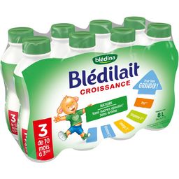 Lait de suite et aliment lacté liquide pour enfant en bas âge Blédilait Croissance Nature 8X1L a été développé par nos experts pour contribuer à répondre aux besoins nutritionnels de votre enfant jusqu'à ses 3 ans(1) . Il est sans arôme et sans sucres ajoutés(2) pour ne pas habituer votre enfant au goût trop sucré. (1) Conformément à la règlementation (2) Contient des sucres naturellement présents