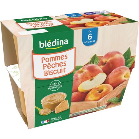 Blédina Pommes Pêches Biscuit. Bébé grandit, pour un goûter savoureux, donnez-lui une tétée ou un biberon de Blédilait 2ème âge, et une coupelle biscuitée. Et pour varier les plaisirs, blédina propose aussi des purées 100% fruits ou avec une touche d'épices. Purée de fruits au biscuit adaptée à bébé