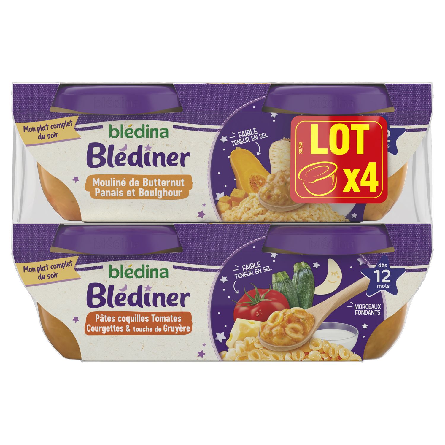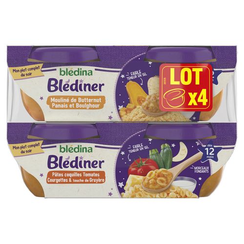 BLEDINA BLEDINER BOLS Mouliné de butternut panais et boulghour : Ingrédients : Lait écrémé reconstitué à base de lait en poudre 32,5 % (LAIT) - Butternut 25,1 % - Panais 10,0 % - Boulghour cuit 9,0 0 % (GLUTEN) - Carottes - Eau de cuisson - Céleri (CELERI) - Oignons - Crème (LAIT) - Pommes de terre - Amidon de maïs - Huiles végé tales (colza, tournesol) - Persil - Sel - Curcuma - CuminBLEDINA BLEDINER BOLS Pâtes coquilles tomates courgettes et touche de gruyère : Ingrédients : Lait écrémé reconstitué à base de lait en poudre 27,7 % (LAIT) - Purée de tomates à base de concentré 23,1 % - Pâtes cuites 12,0 % (Semoule de blé dur (GLUTEN), Blanc d'oeuf en poudre (OEUF)) - Courgettes 11,1 % - Pommes de terre - Oignons - Carottes - Amidon de maïs - Crème 2,00 % (LAIT) - Gruyère fondu 1,60 % (LAIT) (Gruyère, Eau, Beurre, Epaississant : gomme xanthane) - Lait é crémé en poudre 1,53 % (LAIT) - Huiles végétales (colza, tournesol) - Epinards - Sel - Basilic - Ail - Muscade