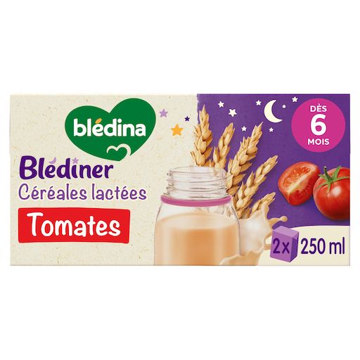 NOUVELLE RECETTE : BLEDINER 2x250mL Tomate- Céréales lactées dès 6 mois. Pour varier de ses dîners habituels, découvrez une gamme de savoureuses céréales lactées adaptées aux besoins de bébé1 pour le dîner. BLEDINER Tomate, c'est un savoureux repas complet pour bébé avec un apport lacté adapté2, des céréales et des légumes au goût tout doux ! Et le tout dans un format pratique & prêt à l'usage ! 1 Conformément à la réglementation de l'alimentation infantile 2Un apport lacté adapté qui participe à la couverture des besoins de bébé en calcium, fer et omega 3 (DHA & Acide alpha-linolénique) Consultez la liste d'ingrédients.