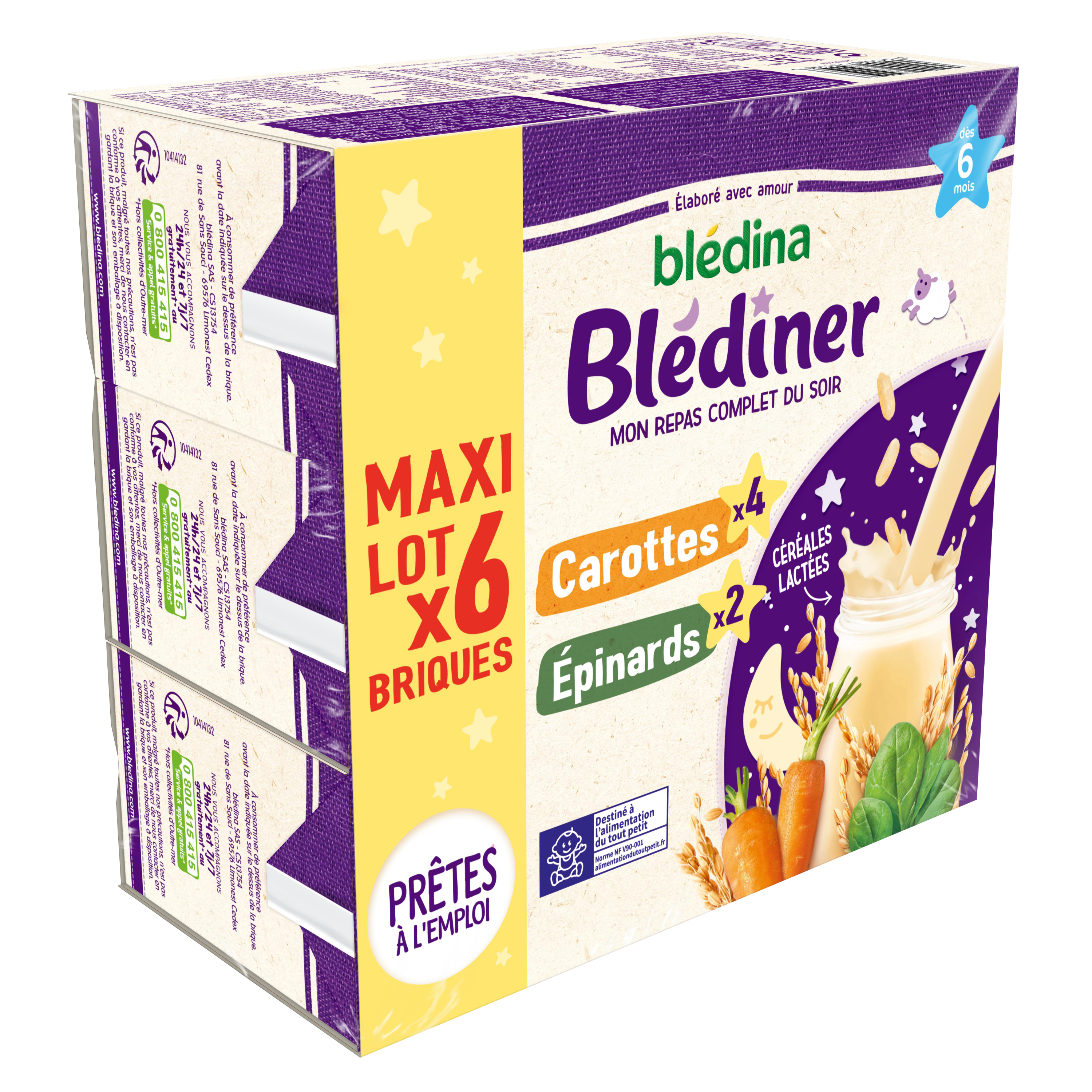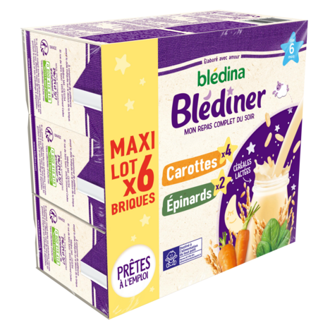 BLEDINER BRIQUES MAXI LOT 6x250ml Carottes / Epinards Dès 6 mois : Ingrédients : Eau - Lait écrémé 41,0 % (LAIT) - Maltodextrines - Matières grasses végétales (palme, coprah, colza, tournesol) - Farine de riz 1,9 % - Lactose (LAIT) - Amidon de maïs - Carotte en poudre 0,8 % - Lactosérum déminéralisé (LAIT) - Sucre - Correcteurs d'acidité (bicarbonate de sodium, hydroxyde de potassium) - Emulsifiant : lécithine de soja (SOJA) - Minéraux (carbonate de calcium, diphosphate ferrique, sulfate de zinc et iodure de potassium) - Vitamines (A, E, D3, K1, C, B1, B2, B3, B6, B9, B12, B5 et B8) - Dextrose - Antioxydant : extrait riche en tocophérolsBLEDINER BRIQUES MAXI LOT 6x250ml Carottes / Epinards Dès 6 mois : Ingrédients : Eau - Lait écrémé 42,2 % (LAIT) - Maltodextrines - Matières grasses végétales (palme, coprah, colza, tournesol) - Farine de riz 2,0 % - Lactose (LAIT) - Amidon de maïs - Epinards en poudre 0,4 % - Lactosérum déminéralisé (LAIT) - Sucre - Flocons de pommes de terre - Carottes en poudre - Correcteurs d'acidité (bicarbonate de sodium, hydroxyde de potassium) - Emulsifiant : lécithine de soja (SOJA) - Minéraux (carbonate de calcium, diphosphate ferrique, sulfate de zinc et iodure de potassium) - Vitamines (A, E,D3, K1, C, B1, B2, B3, B6, B9, B12, B5 et B8) - Dextrose - Antioxydant : extrait riche en tocophérols