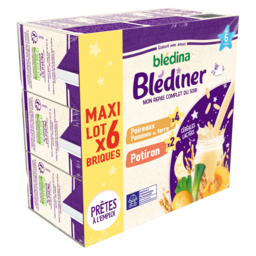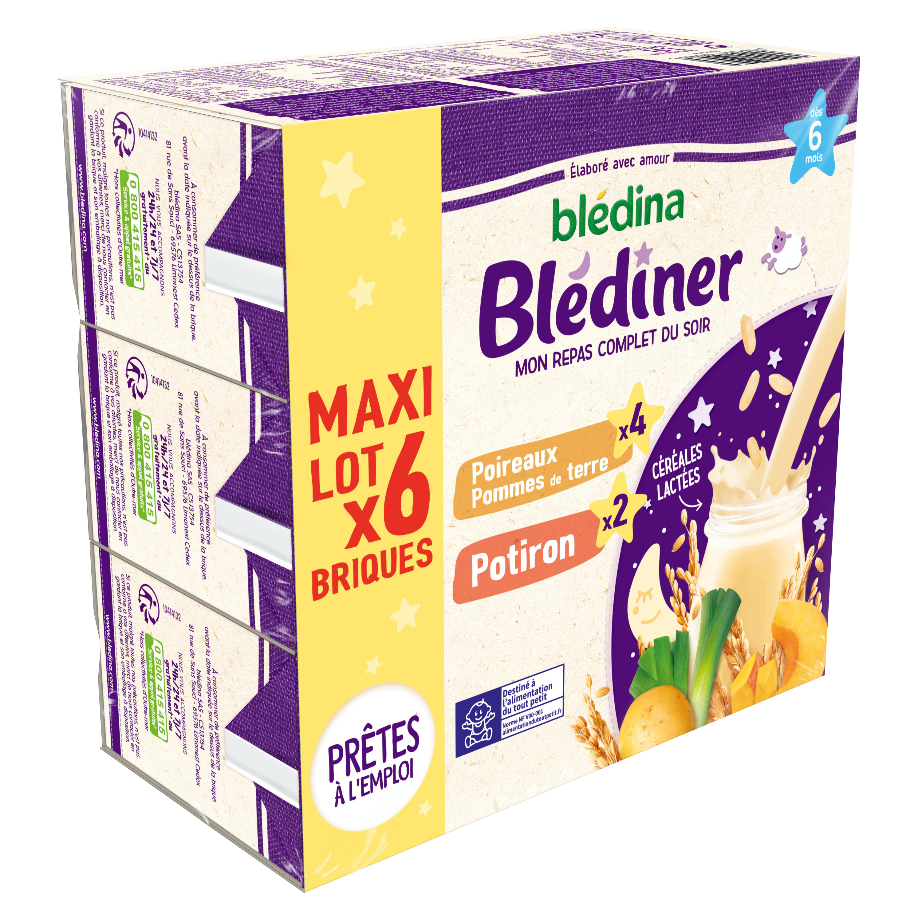 Céréales lactées pour bébés BLEDINER 6x250mL Poireaux pommes de terre / Potiron - Céréales lactées dès 6 mois. Pour varier de ses dîners habituels, découvrez une gamme de savoureuses céréales lactées adaptées aux besoins de bébé1 pour le dîner. BLEDINER Poireaux pommes de terre / Potiron, c’est un savoureux dîner complet pour bébé avec un apport lacté adapté2, des céréales et des légumes au goût tout doux ! Et le tout dans un format pratique & prêt à l’usage ! 1 Conformément à la réglementation de l'alimentation infantile 2Un apport lacté adapté qui participe à la couverture des besoins de bébé en calcium, fer et omega 3 (Acide alpha-linolénique)2Un apport lacté adapté qui participe à la couverture des besoins de bébé en calcium, fer et omega 3 (Acide alpha-linolénique)