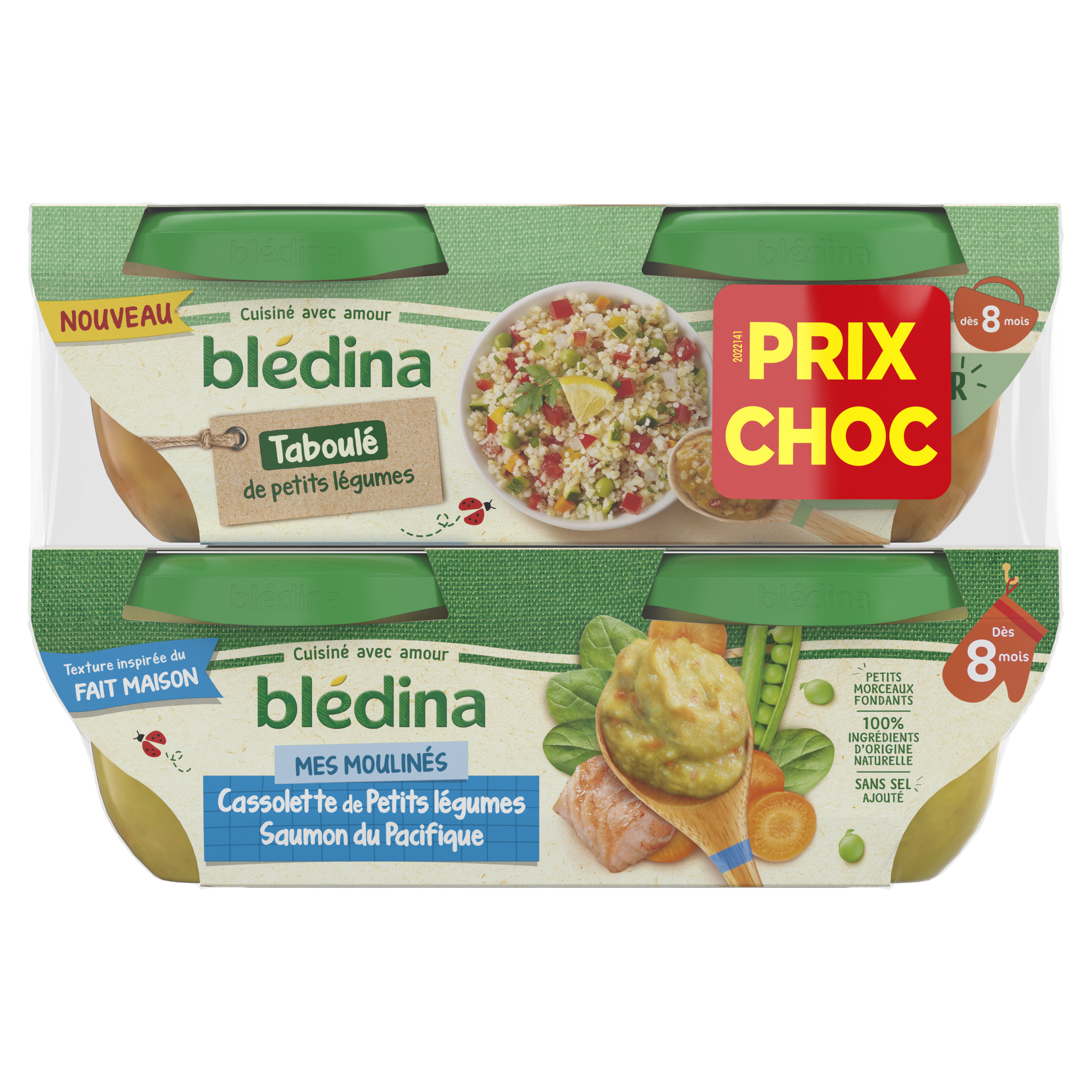 BLEDINA BOLS 200GX4 PRIX CHOC Légumes et saumon du pacifique : Ingrédients : De l'eau de cuisson - des petits pois 15,9 % - des pommes de terre - du brocolis - du saumon kéta et/ou rose du Pacifique en proportion variable 8,10 % (POISSON) - de succulentes carottes 8,03 % - des courgettes - des oignons - des poireaux - de l'amidon de maïs - de la crème (LAIT) - un filet d'huiles végétales (colza, tournesol) - un brin de persil - une pointe d'ail BLEDINA BOLS 200GX4 PROMO Taboulé : Ingrédients : Eau de cuisson - Purée de tomates à base de concentré 10,4 % - Boulghour cuit (GLUTEN) - Semoule de blé dur cuite 9,00 % (GLUTEN) - Carottes 9,00 % - Oignons - Courgettes 8,00 % - Petits pois 6,67 % - Panais 5,67 % - Poivrons 2,67 % - Amidon de maïs - Céleri 2,33 % (CELERI) - Jus de citron concentré 1,20 % - Huiles végétales (colza, tournesol) - Huile d'olive vierge extra aromatisée à la menthe poivrée - Ail - Basilic 0,300 % - Epices et herbe aromatique. Peut contenir des traces de SOJA et MOUTARDE.