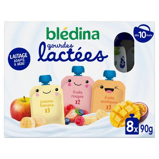 BLEDINA Gourdes Lactées 8X85G Pomme Banane, Fruits Exotiques, Fruits Rouges - Dès 10 mois: