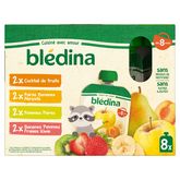 BLEDINA Gourdes Cocktail de fruits : Purée de pommes 57,5 % - Purée de poires 17,5 % - Purée de bananes 13,0 % - Purée d'abricots 12,0 % - Vitamine C - Jus de citron concentré* - *présence en fonction de l'acidité des fruits BLEDINA Gourdes Pommes Poires : Purée de pommes 65,0 % - Purée de poires 35,0 % - Vitamine C - Jus de citron concentré* *présence en fonction de l'acidité des fruits BLEDINA Gourdes Bananes Pommes Fraises Kiwis : Purée de bananes 33,0 % - Purée de pommes 28,5 % - Purée de fraises 20,0 % - Purée de kiwis 17,0 % - Purée de carottes pourpres - Vitamine C - Jus de citron concentré* *présence en fonction de l'acidité des fruits. La carotte pourpre est ajoutée pour sa couleur. BLEDINA Gourdes Poires Bananes Abricots : Purée de poires 42,5 % - Purée de bananes 40,0 % - Purée d'abricots 17,5 % - Vitamine C - Jus de citron concentré* - * présence en fonction de l'acidité des fruits