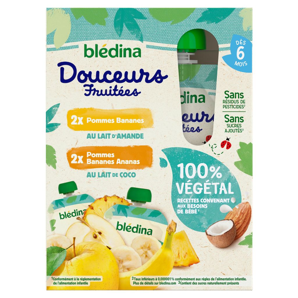BLEDINA Douceurs Fruitées 100% végétale Pommes Bananes : Ingrédients : Purée de pommes 62 %, Purée de bananes 18 % , Purée d'ananas 10%, Lait de coco 10 % (extrait de noix de coco, eau) - Jus de citron concentré* *présence en fonction de l'acidité des fruits BLEDINA Douceurs Fruitées 100% végétale Pommes Bananes : Ingrédients : Lait d'amande 36 % ((eau, amandes (FRUITS A COQUES)) - Purée de bananes 33,5 % - Purée de pommes 28 % - Farine de riz - Jus de citron concentré* *présence en fonction de l'acidité des fruits - Traces d'autres FRUITS A COQUES