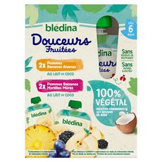 :BLEDINA Douceurs Fruitées 100% végétale Pommes Bananes Ananas:Ingrédients : Purée de pommes 62 %, Purée de bananes 18 % , Purée d'ananas 10%, Lait de coco 10 % (extrait de noix de coco, eau) - Jus de citron concentré* *présence en fonction de l'acidité des fruits :BLEDINA Douceurs Fruitées 100% végétale Pommes Bananes Ananas:Ingrédients : Purée de pommes 56 %, Purée de bananes 16 % , Lait de coco 10 % (extrait de noix de coco, eau) - Purée de myrtilles 10% - Purée de mûres 8 % - Jus de citron concentré* *présence en fonction de l'acidité des fruits