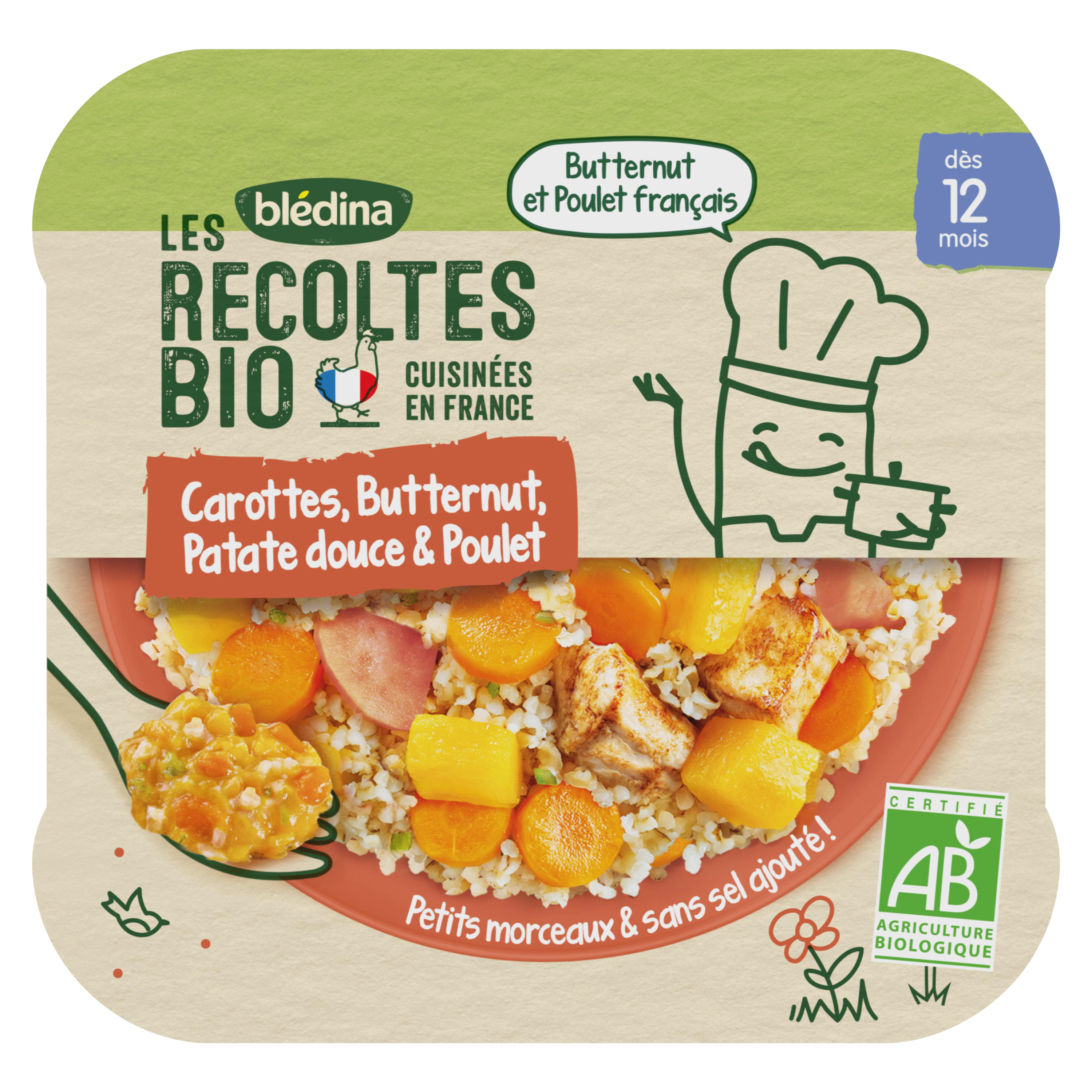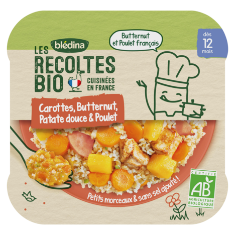 Expert de la diversification alimentaire depuis plus de 100 ans, Blédina vous accompagne pour tous les repas de votre bébé. Notre mission ? Eveiller sa curiosité pour le manger vrai, grâce à plus de 250 recettes conçues par des nutritionnistes et parfaitement adaptées à ses besoins. Blédina Les Récoltes Bio - Carottes, Butternut, Patate douce & Poulet dès 12 mois. Les Récoltes Bio de Blédina a conçu de délicieux petits plats bio pour continuer à régaler bébé dès 12 mois avec des légumes, féculents et viandes bio. Ces petits plats, avec des petits morceaux, pourront être proposés à votre enfant au moment du déjeuner.