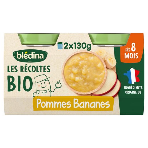 Les Récoltes Bio de Blédina ce sont plus de 35 recettes adaptées aux besoins* de bébé. Nos petits pots sont engagés pour l'agriculture durable avec nos agriculteurs partenaires, et cuisinés en France à Brive-la-Gaillarde. Blédina Les Récoltes Bio - Pommes Bananes dès 8 mois, avec morceaux fondants. Des recettes co-développées avec parents et bébés : la juste dose de morceaux fondants** enrobés dans une purée gourmande. Sans sucres ajoutés*** Bon à savoir : l'acceptation des morceaux par bébé peut nécessiter plusieurs tentatives. *Selon la réglementation de l'alimentation infantile **Etude réalisée en 2019 avec 14 bébés ***Contient les sucres naturels des fruits