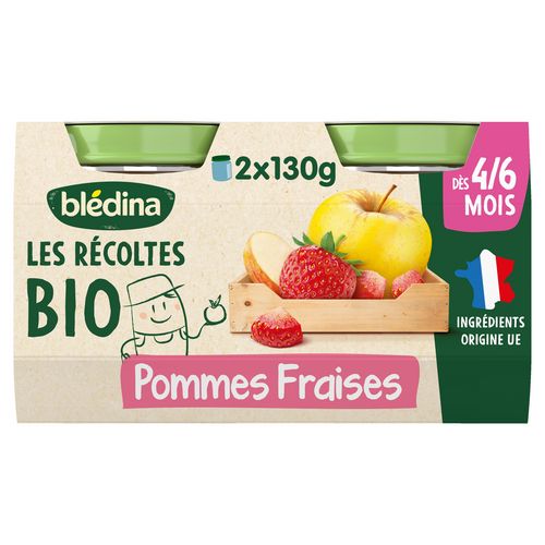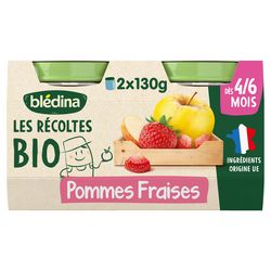 Blédina Les Récoltes Bio - Pommes Fraises dès 4/6 mois. Les Récoltes Bio, de délicieux petits pots bio pour faire découvrir à bébé ses premiers fruits tout en douceur.