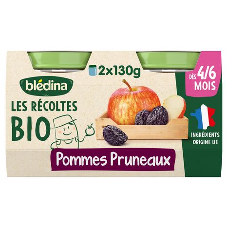 Les Récoltes Bio de Blédina ce sont plus de 35 recettes adaptées aux besoins* de bébé. Nos petits pots sont engagés pour l'agriculture durable avec nos agriculteurs partenaires, et cuisinés en France à Brive-la-Gaillarde. Blédina Les Récoltes Bio - Pommes Pruneaux dès 4/6 mois. De délicieux petits pots bébé bio pour faire découvrir à bébé ses premiers fruits tout en douceur, avec une texture lisse idéale pour les premières cuillères. *Selon la réglementation de l'alimentation infantile