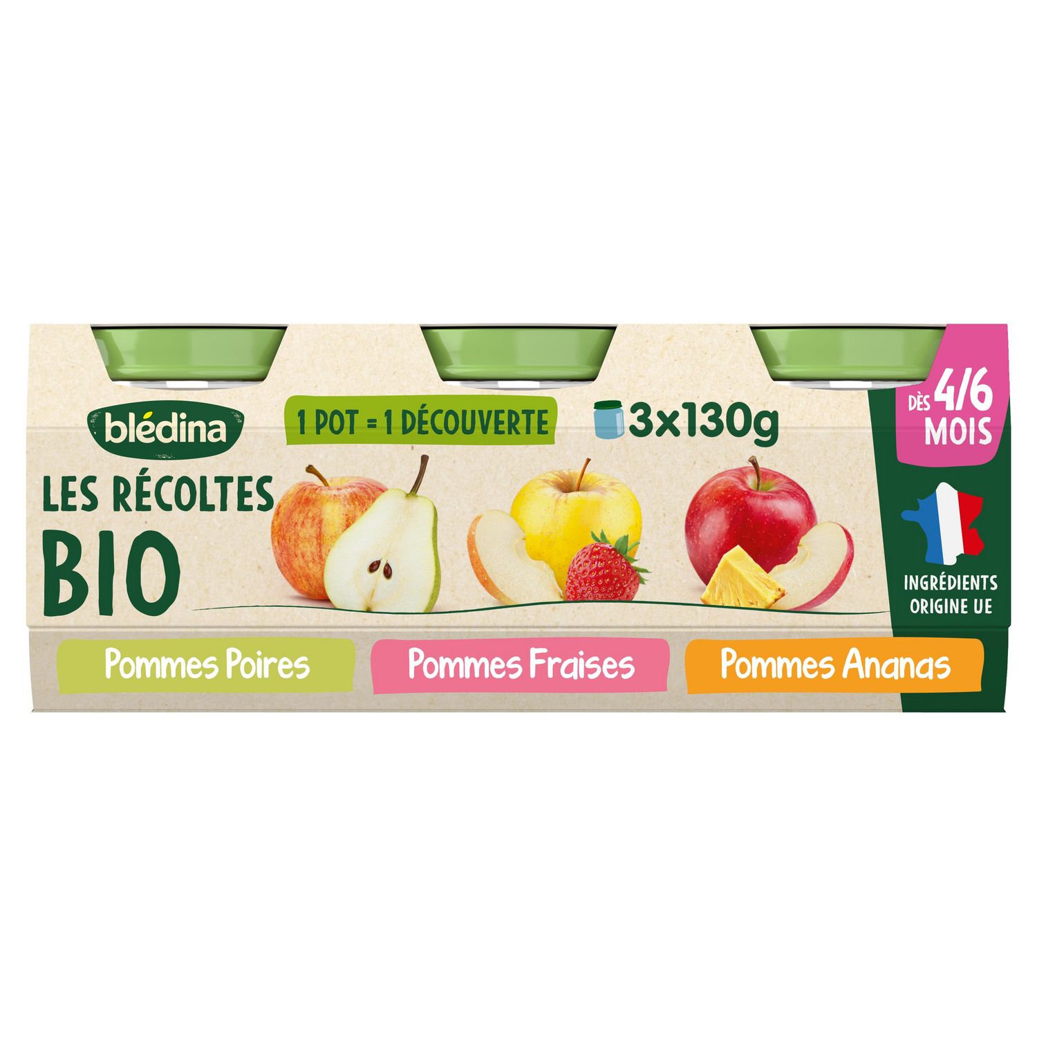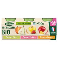 Les Récoltes Bio de Blédina ce sont plus de 35 recettes adaptées aux besoins* de bébé. Nos petits pots sont engagés pour l'agriculture durable avec nos agriculteurs partenaires, et cuisinés en France à Brive-la-Gaillarde. Blédina Les Récoltes Bio - Pommes Poires, Pommes Fraises, Pommes Ananas dès 4/6 mois. 1 POT = 1 DECOUVERTE pour faire découvrir à bébé ses premiers fruits tout en douceur, avec une texture lisse idéale pour les premières cuillères. *Selon la réglementation de l'alimentation infantile