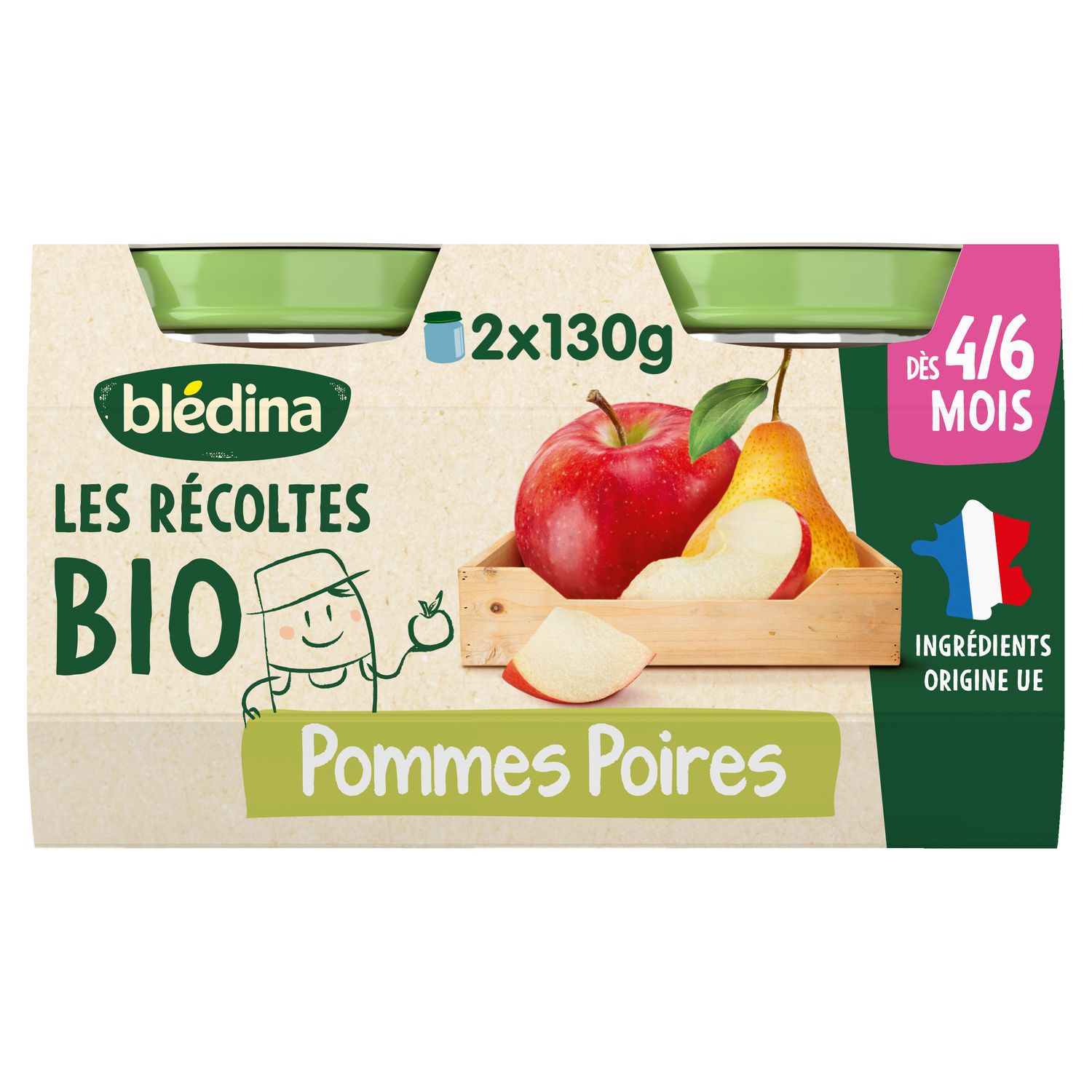 Les Récoltes Bio de Blédina ce sont plus de 35 recettes adaptées aux besoins* de bébé. Nos petits pots sont engagés pour l'agriculture durable avec nos agriculteurs partenaires, et cuisinés en France à Brive-la-Gaillarde. Blédina Les Récoltes Bio - Pommes Poires dès 4/6 mois. De délicieux petits pots bébé bio pour faire découvrir à bébé ses premiers fruits tout en douceur, avec une texture lisse idéale pour les premières cuillères. *Selon la réglementation de l'alimentation infantile
