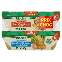 Expert de la diversification alimentaire depuis plus de 100 ans, Blédina vous accompagne pour tous les repas de votre bébé. Notre mission ? Eveiller sa curiosité pour le manger vrai, grâce à plus de 250 recettes conçues par des nutritionnistes et parfaitement adaptées à ses besoins. BLEDINA MES MOULINÉS. Écrasé de Pommes de terre Poulet - dès 8 mois. Découvrez ces plats pour bébé, de délicieuses recettes inspirées du fait-maison à la texture adaptée à chaque âge de bébé. Le tout dans un bol pratique et refermable. BLEDINA MES MOULINÉS. Cassolette de Petits Légumes Saumon du Pacifique - dès 8 mois. Découvrez ces plats pour bébé, de délicieuses recettes inspirées du fait-maison à la texture adaptée à chaque âge de bébé. Le tout dans un bol pratique et refermable.