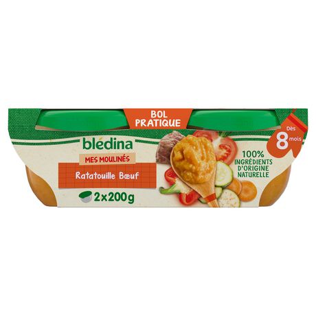 Expert de la diversification alimentaire depuis plus de 100 ans, Blédina vous accompagne pour tous les repas de votre bébé. Notre mission ? Eveiller sa curiosité pour le manger vrai, grâce à plus de 250 recettes conçues par des nutritionnistes et parfaitement adaptées à ses besoins. BLEDINA MES MOULINÉS. Ratatouille Boeuf - dès 8 mois. Découvrez ces plats pour bébé, de délicieuses recettes inspirées du fait-maison à la texture adaptée à chaque âge de bébé. Le tout dans un bol pratique et refermable.