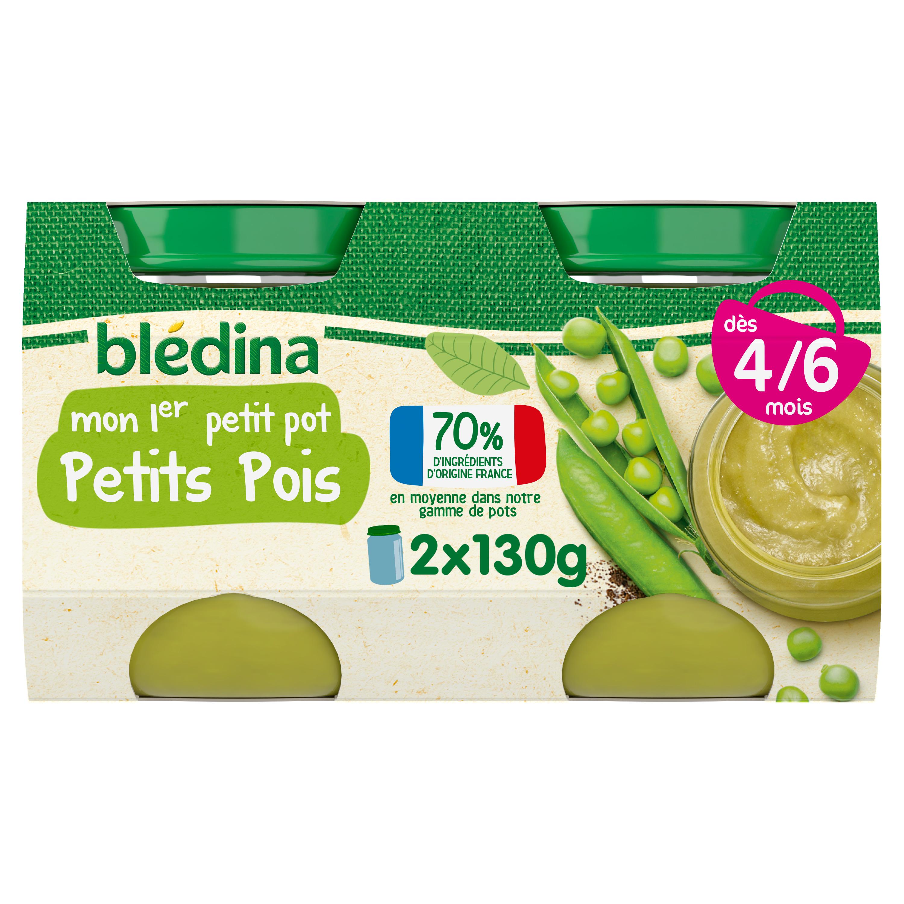 Expert de la diversification alimentaire depuis plus de 100 ans, Blédina vous accompagne pour tous les repas de votre bébé. Notre mission ? Eveiller sa curiosité pour le manger vrai, grâce à plus de 250 recettes conçues par des nutritionnistes et parfaitement adaptées à ses besoins. Blédina Mon 1er Petit Pot - Petits Pois dès 4/6 mois. Mon 1er petit pot blédina, une délicieuse recette pour faire découvrir à bébé ses premiers légumes. A déguster dès 4/6 mois.