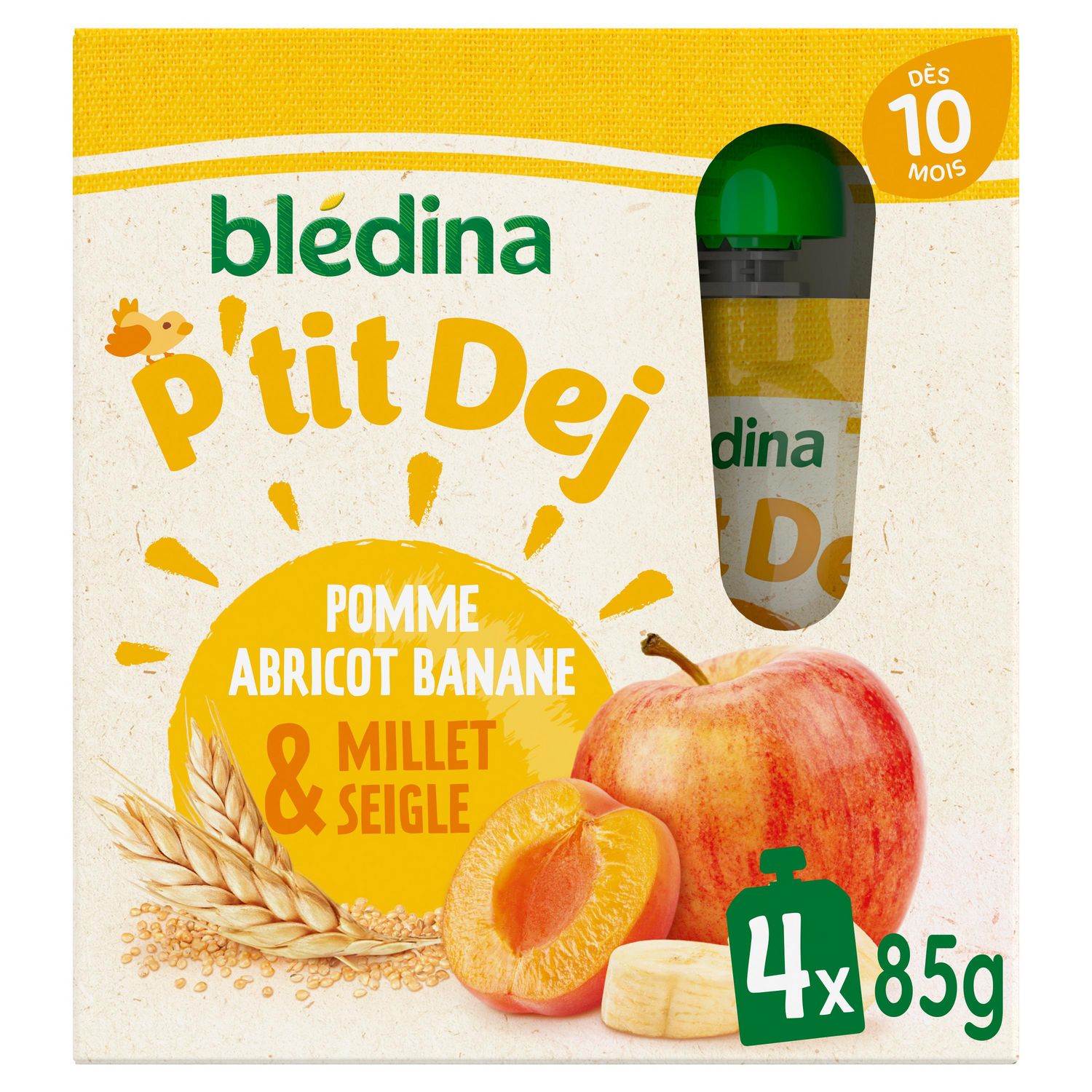 Expert de la diversification alimentaire depuis plus de 100 ans, Blédina vous accompagne pour tous les repas de votre bébé. Notre mission ? Eveiller sa curiosité pour le manger vrai, grâce à plus de 250 recettes conçues par des nutritionnistes et parfaitement adaptées à ses besoins. Chez Blédina, on vous accompagne avec nos gourdes P'tit Dej à base de fruits & céréales pour un petit déjeuner adapté à bébé ! Pour les matins pressés, découvrez notre nouvelle recette gourmande Pomme Abricot Banane & Millet Seigle pour régaler bébé.
