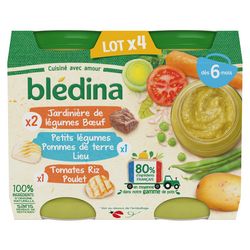 BLEDINA POTS 1 Tomates Riz Poulet Ingrédients : de la purée de tomates à base de concentré 41,6 % - des panais - des carottes - de la viande de poulet 8,70 % - du riz moulu 6 ,70 % - des oignons - un filet d'huiles végétales (colza, tournesol) - de l'ail BLEDINA POTS 1 Petits légumes Pommes de terre Lieu : Ingrédients : Pommes de terre 35,0 % - des carottes 17,0 % - de l'eau de cuisson - des petits pois 9,00 % - du lieu 8,40 % (POISSON) - de la purée de tomates à base de concentré 6,66 % - des courgettes 5,00 % - des poireaux 5,00 % - un filet d'huiles végétales (colza, tournesol) BLEDINA POTS 2 Jardinière de légumes Boeuf: Ingrédients : des pommes de terre 26,7 % - de succulentes carottes 20,0 % - de l'eau de cuisson - des petits pois 9,00 % - des haricots verts 9 ,00 % - de la viande de boeuf 8,00 % - des épinards 8,00 % - des poireaux 4,00 % - un filet d'huiles végétales (colza, tournesol)