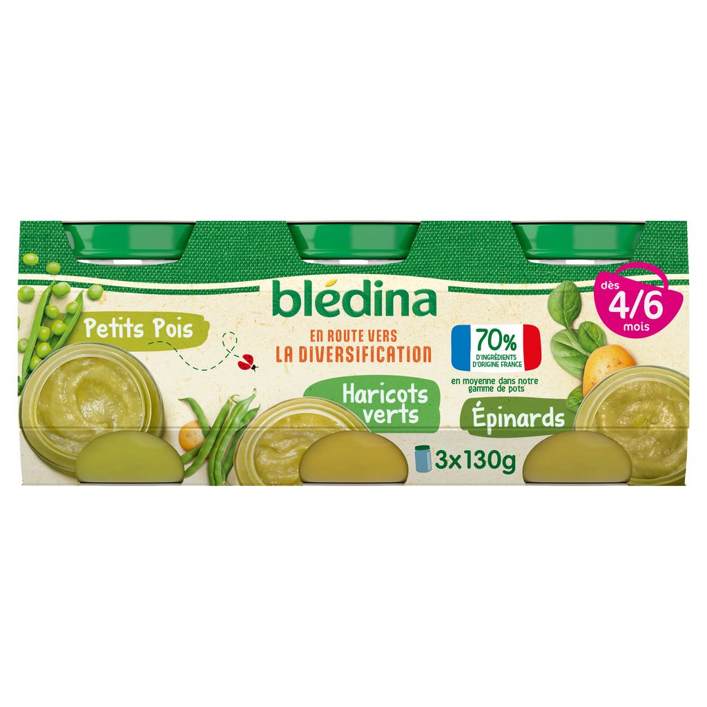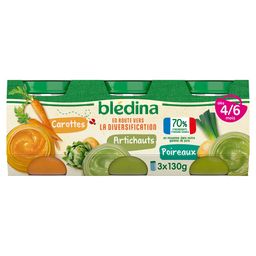 Expert de la diversification alimentaire depuis plus de 100 ans, Blédina vous accompagne pour tous les repas de votre bébé. Notre mission ? Eveiller sa curiosité pour le manger vrai, grâce à plus de 250 recettes conçues par des nutritionnistes et parfaitement adaptées* à ses besoins. Blédina Mon 1er Petit Pot - Carottes / Artichauts / Poireaux dès 4/6 mois. 1 pot = 1 découverte d'un nouveau légume ! Une texture lisse idéale pour les premières cuillères à déguster dès 4/6 mois. *Conformément à la réglementation de l'alimentation infantile.