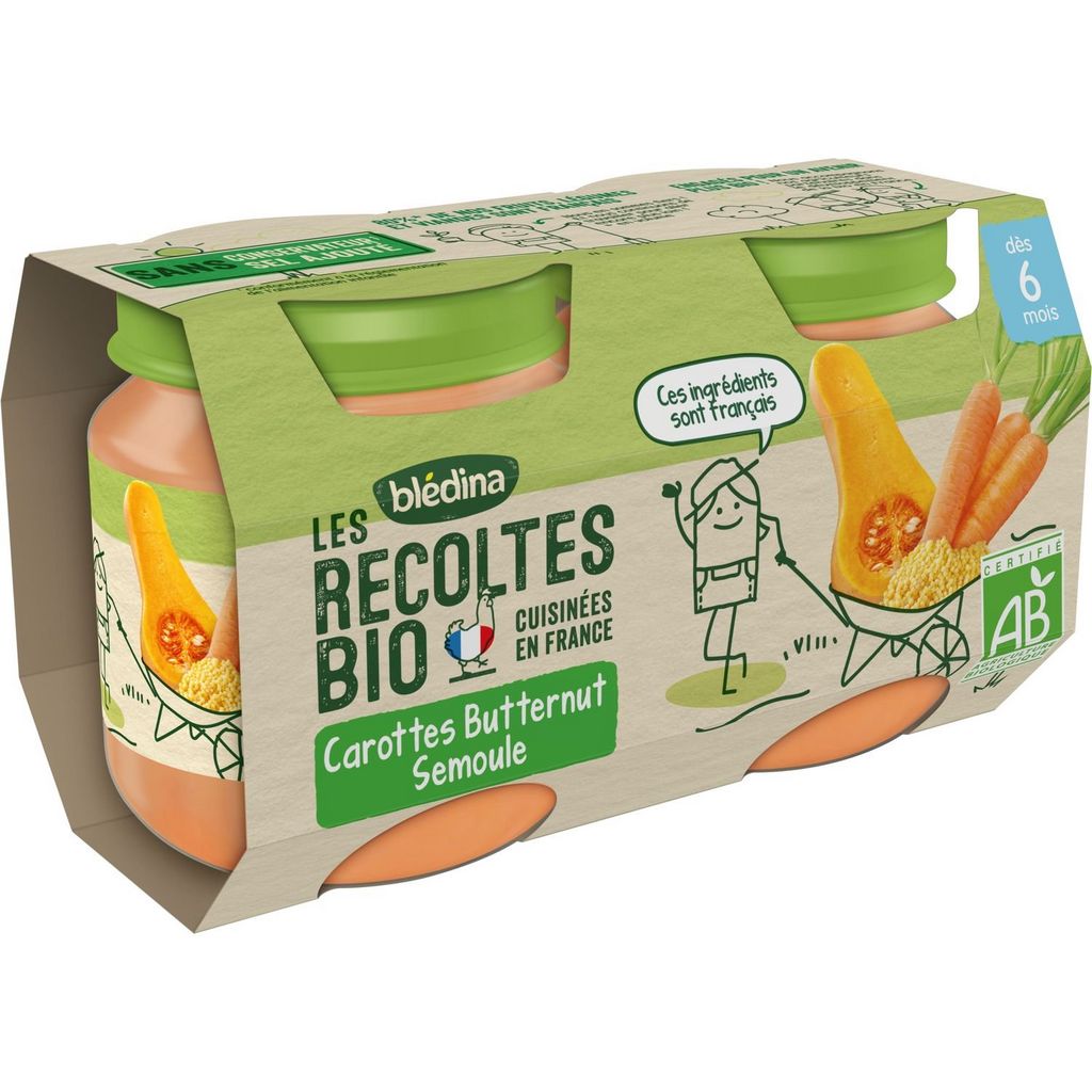 Purée de légumes adaptée à bébé. BLEDINA LES RECOLTES BIO Carottes Butternut Semoule 2x130g Dès 6 Mois