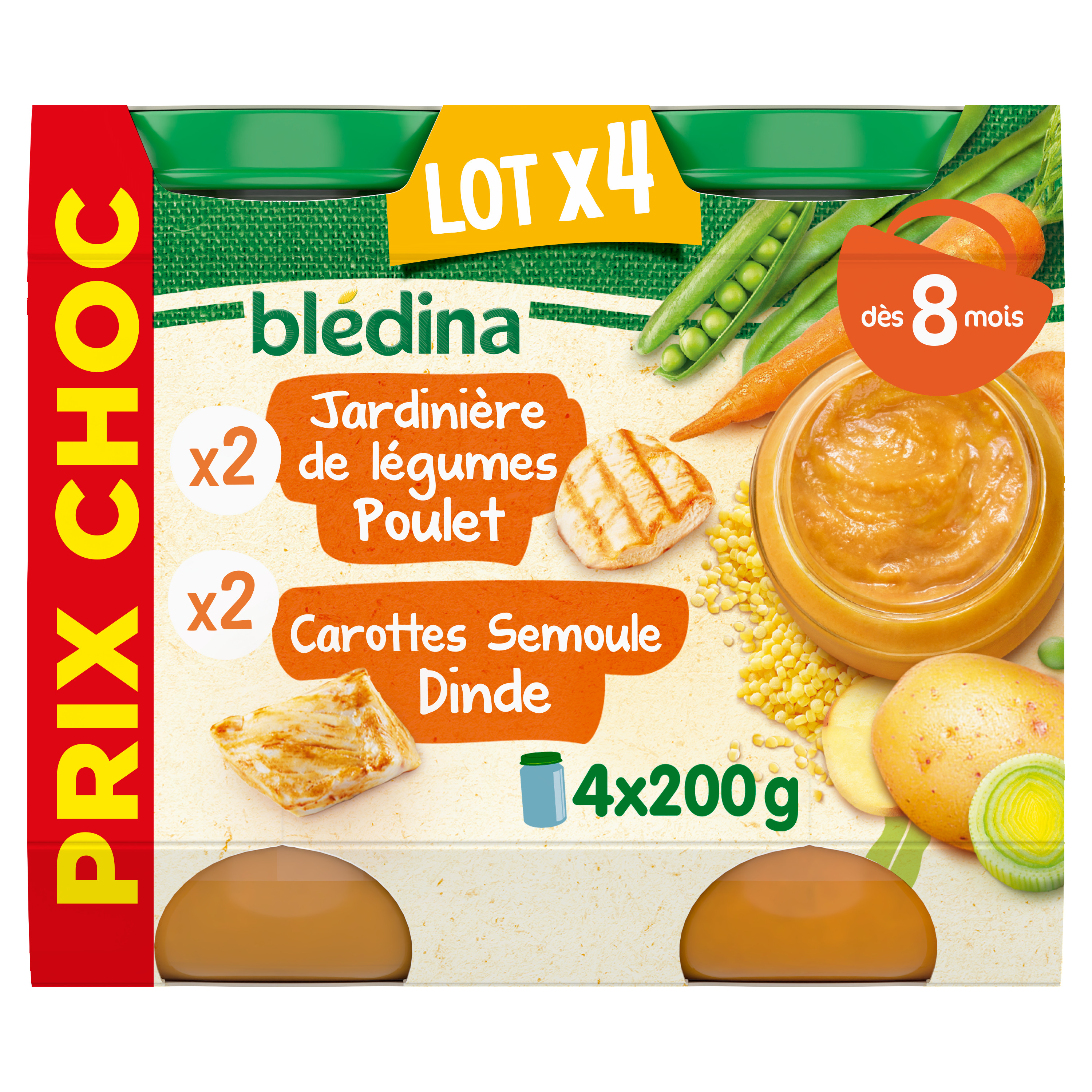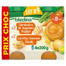 BLEDINA POTS SALES 4x200G PRIX CHOC Jardinière de légumes poulet : Ingrédients : de savoureuses pommes de terre 27,8 % - de l'eau de cuisson - des carottes 19,6 % - des petits pois 8,00 % - des haricots verts 8,00 % - de la viande de poulet 8,00 % - des oignons - des poireaux 1,50 % - un filet d'huiles végétales (colza, tournesol) - une pointe de muscade BLEDINA POTS SALES 4x200G PRIX CHOC Carottes semoule dinde : Ingrédients : des carottes 60,0 % - de l'eau de cuisson - de la tendre semoule de blé dur cuite 13,5 % (GLUTEN) - de la viande de dinde 8,00 % - des oignons - un filet d'huiles végétales (colza, tournesol). Peut contenir des traces de SOJA, MOUTARDE