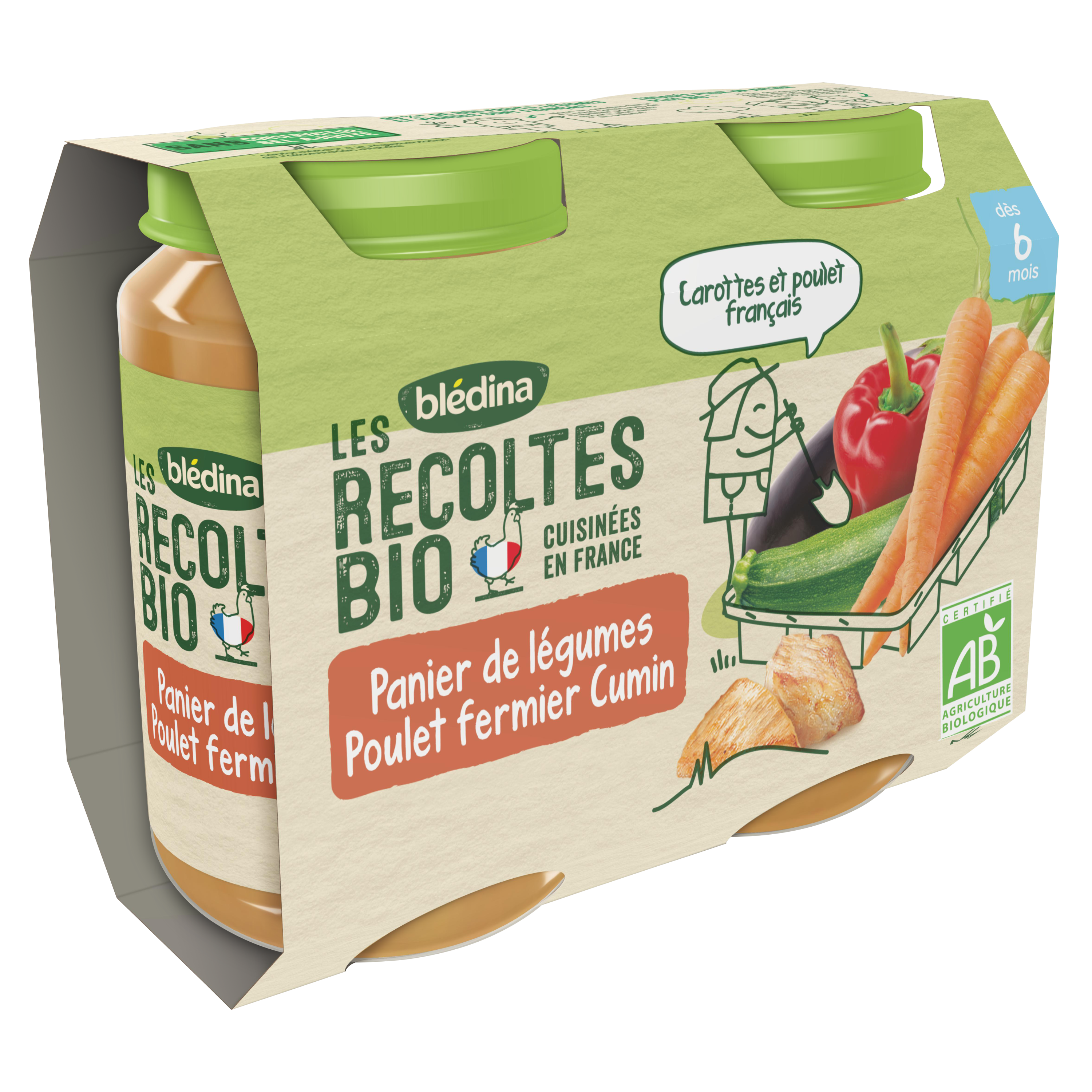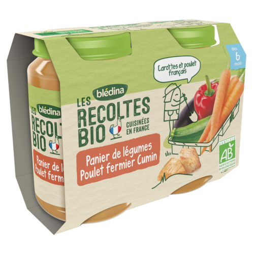 BLEDINA LES RECOLTES BIO Panier de Légumes Poulet Fermier Cumin 2x200g Dès 6 Mois Purée de légumes et de viande adaptée à bébé.