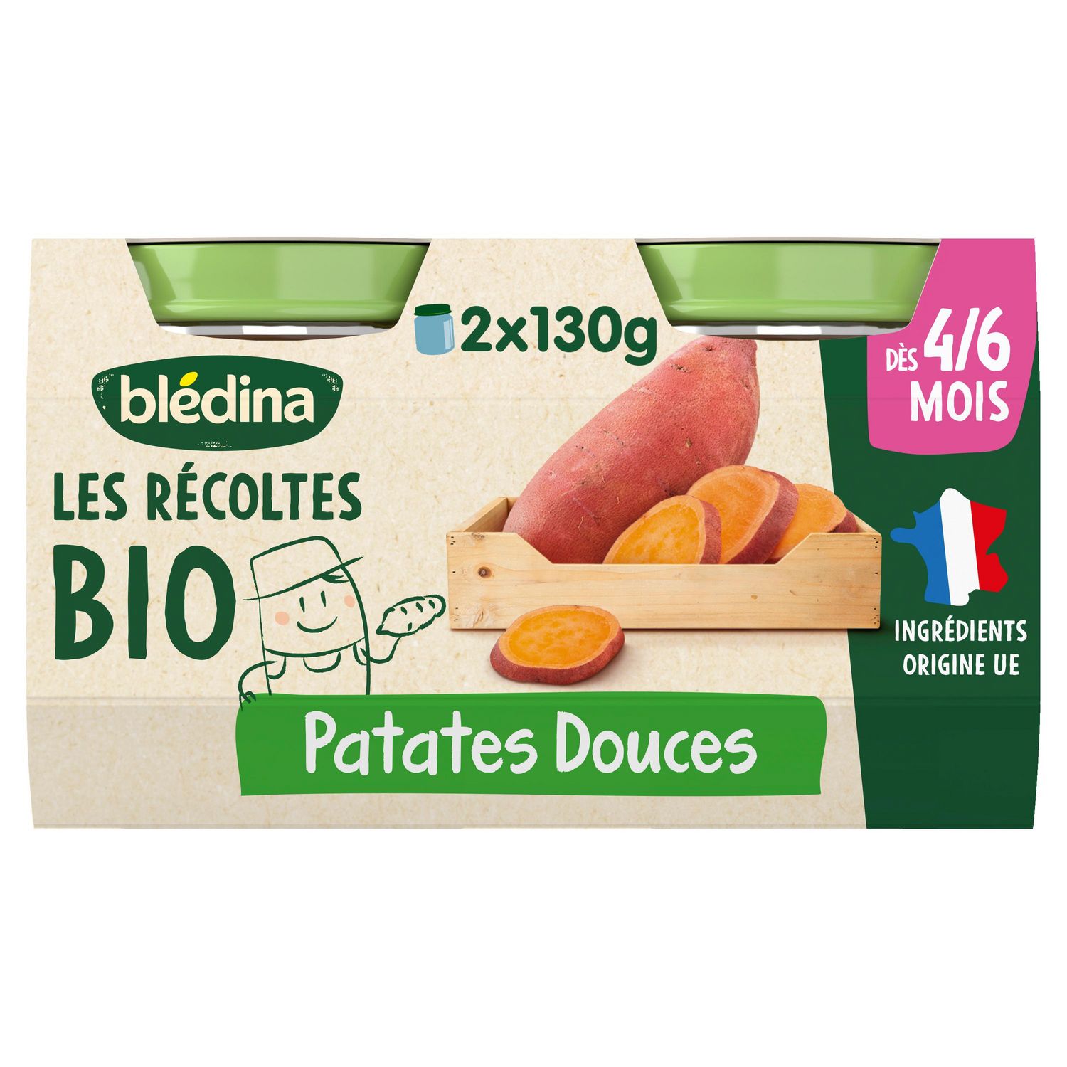 Les Récoltes Bio de Blédina ce sont plus de 35 recettes adaptées aux besoins* de bébé. Nos petits pots sont engagés pour l'agriculture durable avec nos agriculteurs partenaires, et cuisinés en France à Brive-la-Gaillarde. Blédina Les Récoltes Bio - Patates Douces dès 4/6 mois. De délicieux petits pots bébé bio pour faire découvrir à bébé ses premiers légumes tout en douceur, avec une texture lisse idéale pour les premières cuillères. *Selon la réglementation de l'alimentation infantile