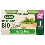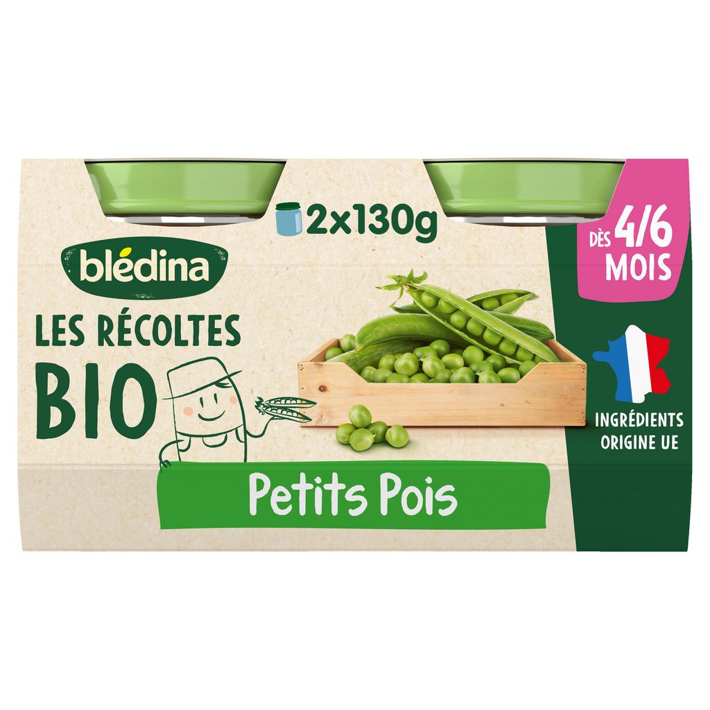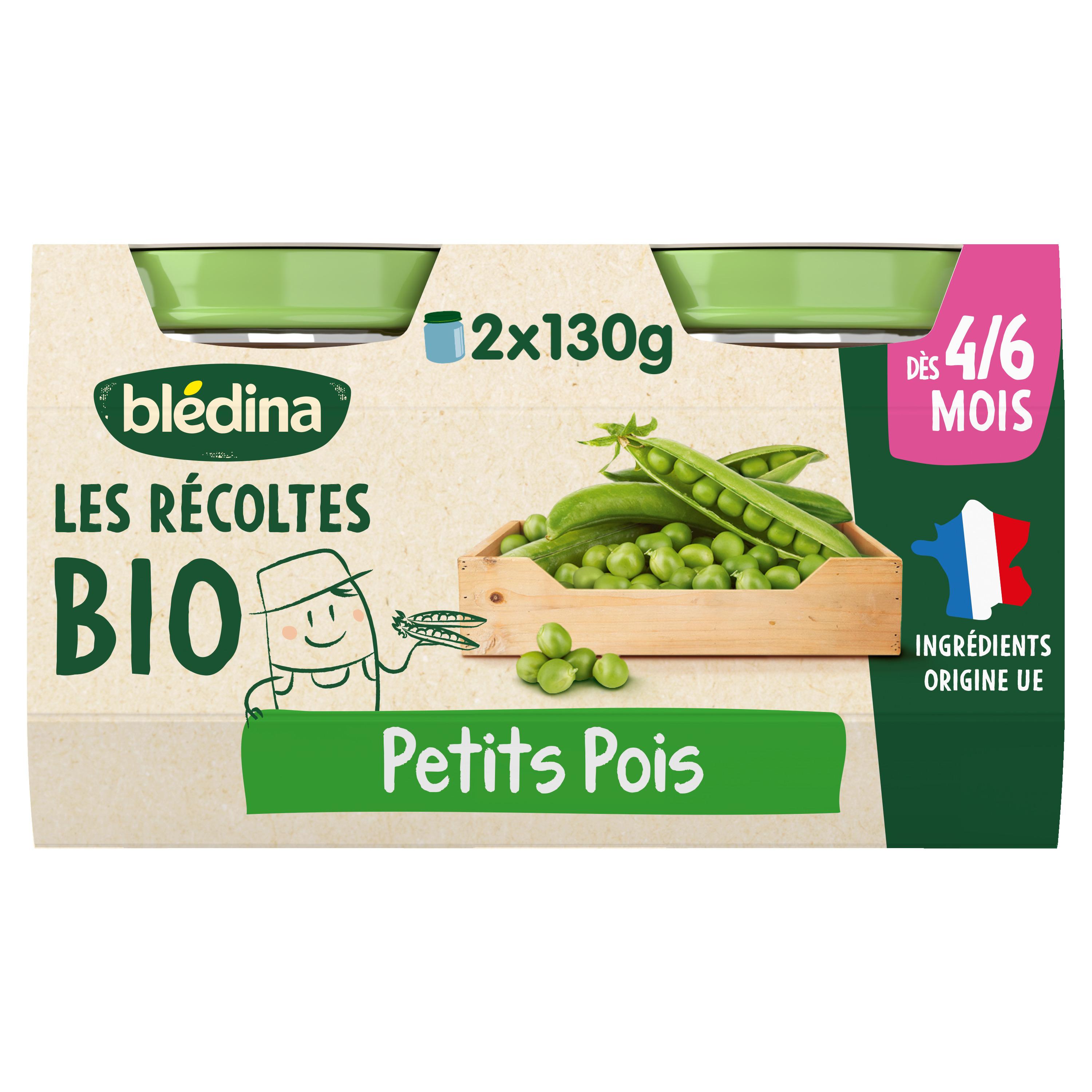 Les Récoltes Bio de Blédina ce sont plus de 35 recettes adaptées aux besoins* de bébé. Nos petits pots sont engagés pour l'agriculture durable avec nos agriculteurs partenaires, et cuisinés en France à Brive-la-Gaillarde. Blédina Les Récoltes Bio - Petits Pois dès 4/6 mois. De délicieux petits pots bébé bio pour faire découvrir à bébé ses premiers légumes tout en douceur, avec une texture lisse idéale pour les premières cuillères. *Selon la réglementation de l'alimentation infantile