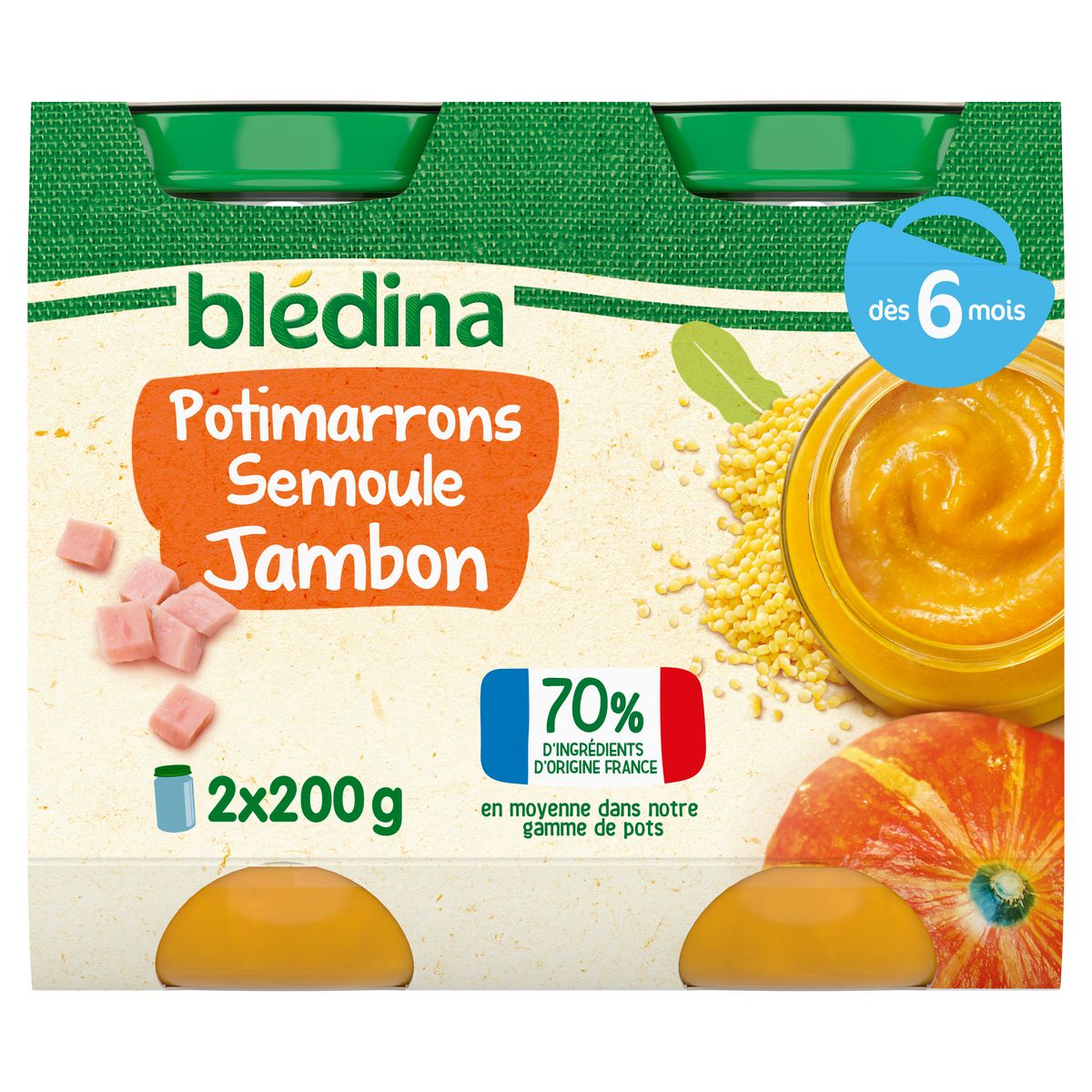 Expert de la diversification alimentaire depuis plus de 100 ans, Blédina vous accompagne pour tous les repas de votre bébé grâce à plus de 250 recettes conçues par des nutritionnistes et parfaitement adaptées à ses besoins*. Blédina - Potimarrons Semoule Jambon dès 6 mois. Les petits pots blédina, de délicieuses recettes pour introduire la viande et le poisson dans l'alimentation de bébé. Une texture lisse et fondante à déguster dès 6 mois. *Selon la réglementation de l'alimentation infantile.