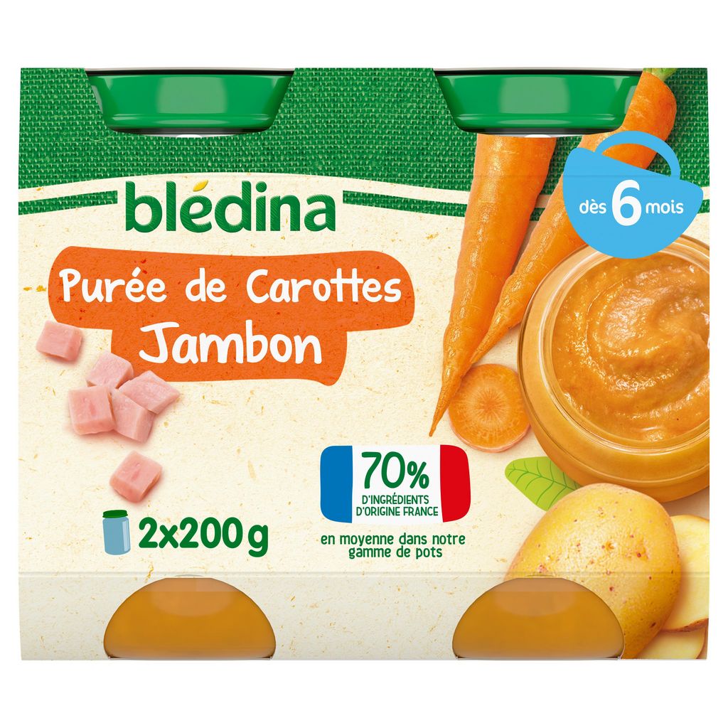 Expert de la diversification alimentaire depuis plus de 100 ans, Blédina vous accompagne pour tous les repas de votre bébé grâce à plus de 250 recettes conçues par des nutritionnistes et parfaitement adaptées à ses besoins*. Blédina - Purée de Carottes Jambon dès 6 mois. Les petits pots blédina, de délicieuses recettes pour introduire la viande et le poisson dans l'alimentation de bébé. Une texture lisse et fondante à déguster dès 6 mois. *Selon la réglementation de l'alimentation infantile.