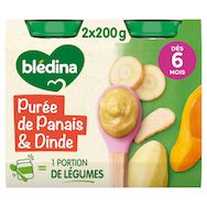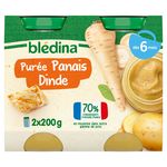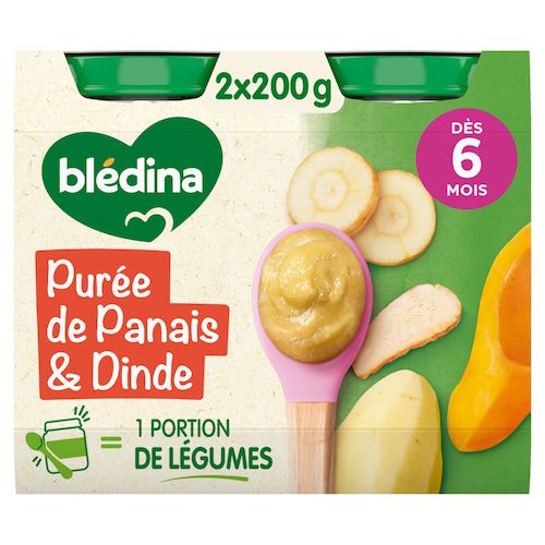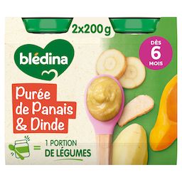 Expert de la diversification alimentaire depuis plus de 100 ans, Blédina vous accompagne pour tous les repas de votre bébé grâce à plus de 250 recettes conçues par des nutritionnistes et parfaitement adaptées à ses besoins*. Blédina - Purée Panais Dinde dès 6 mois. Les petits pots blédina, de délicieuses recettes pour faire découvrir à bébé ses premiers mélanges légumes et de viande. Une texture lisse et fondante à déguster dès 6 mois. *Selon la réglementation de l'alimentation infantile.