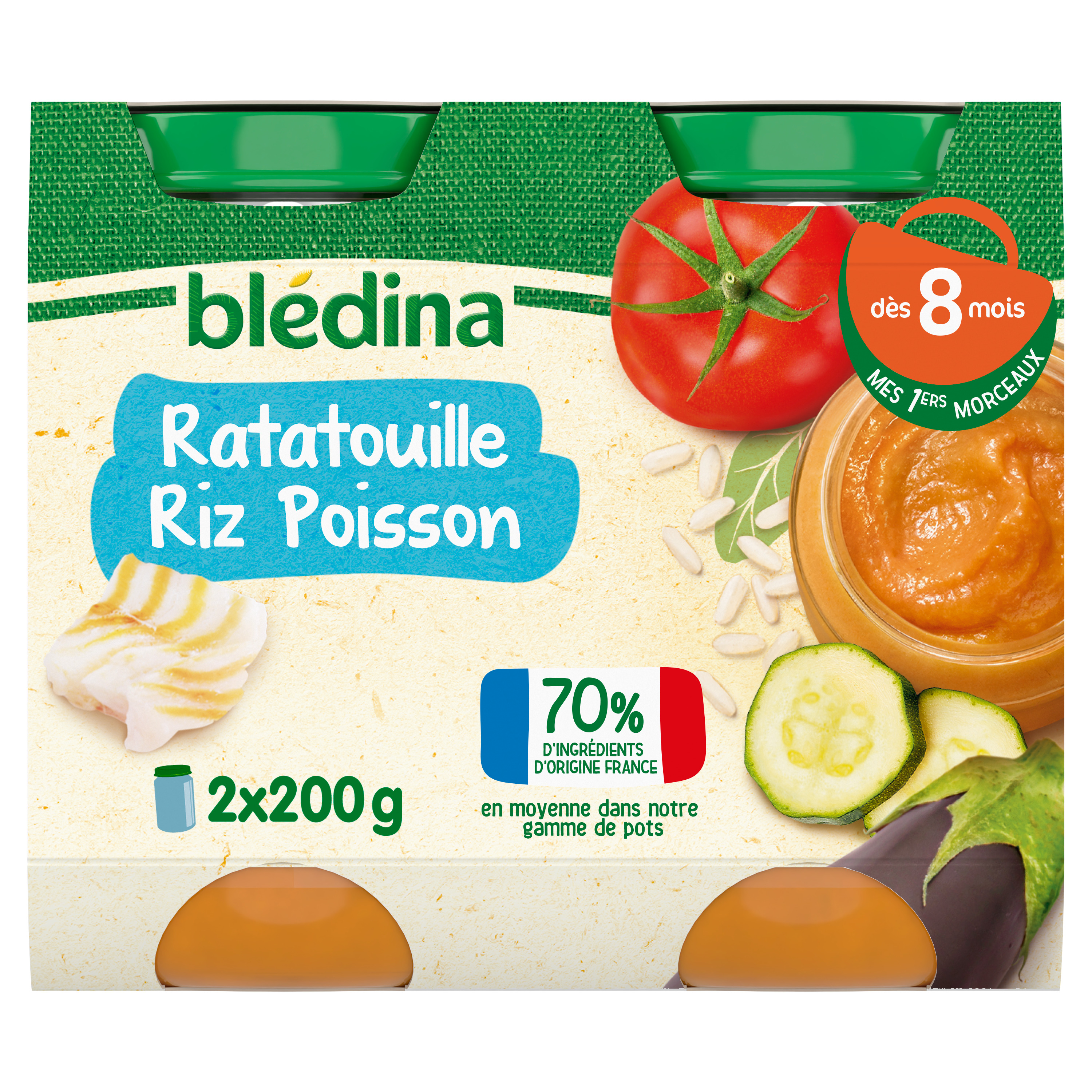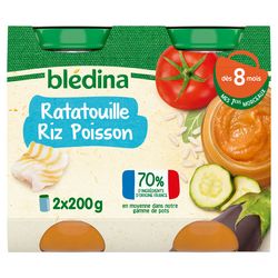 Expert de la diversification alimentaire depuis plus de 100 ans, Blédina vous accompagne pour tous les repas de votre bébé grâce à plus de 250 recettes conçues par des nutritionnistes et parfaitement adaptées à ses besoins*. Blédina - Ratatouille Riz Poisson dès 8 mois. Les petits pots blédina, de délicieuses recettes pour faire découvrir à bébé ses premiers petits morceaux fondants à base de légumes, de féculents et de poisson. Des petits morceaux fondants à déguster dès 8 mois. *Selon la réglementation de l'alimentation infantile.