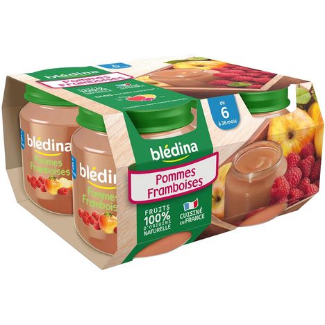 BLEDINA POTS FRUITS Pommes Framboises 4x130g Dès 6 Mois Purée de fruits adaptée à bébé.